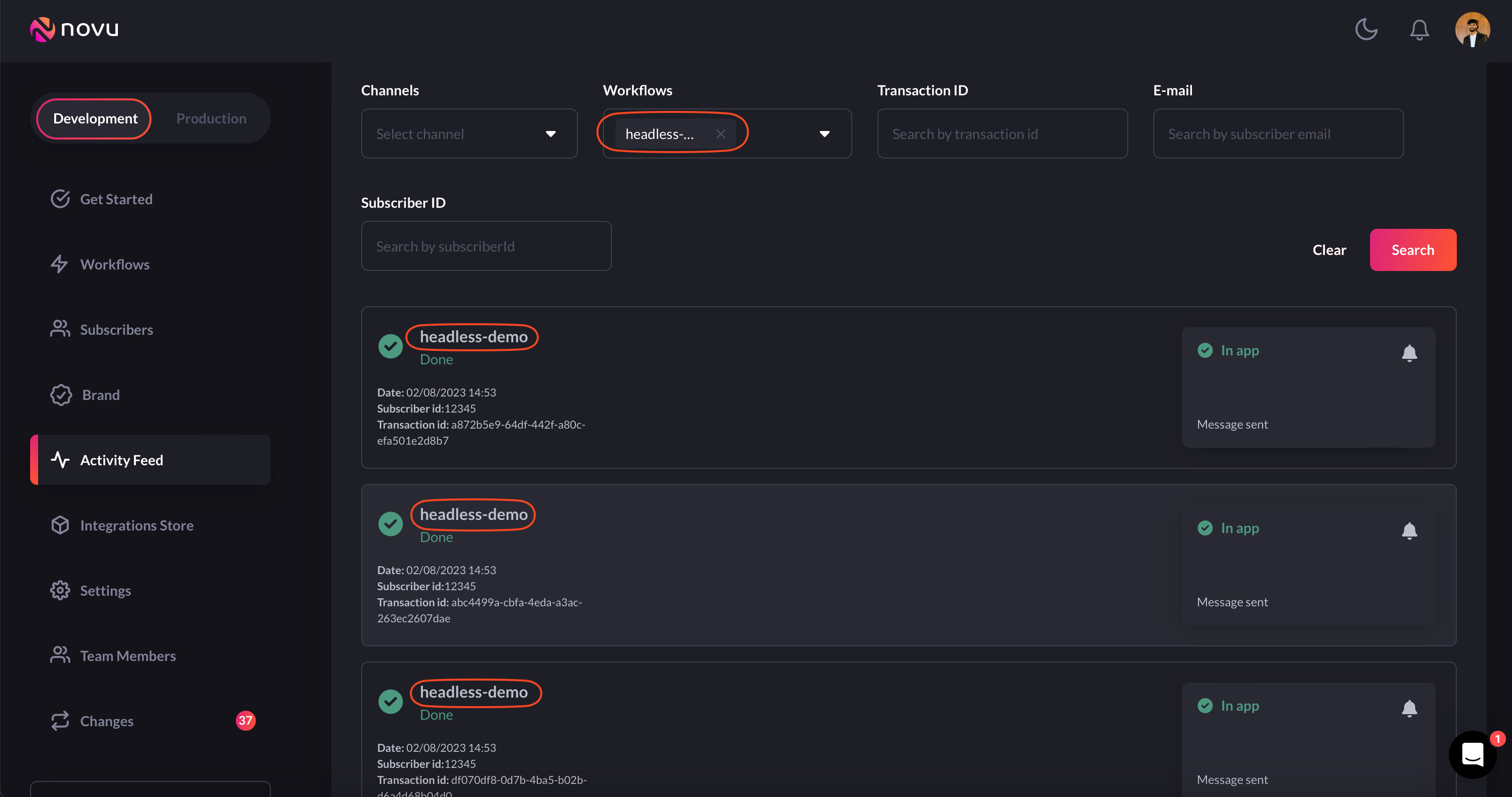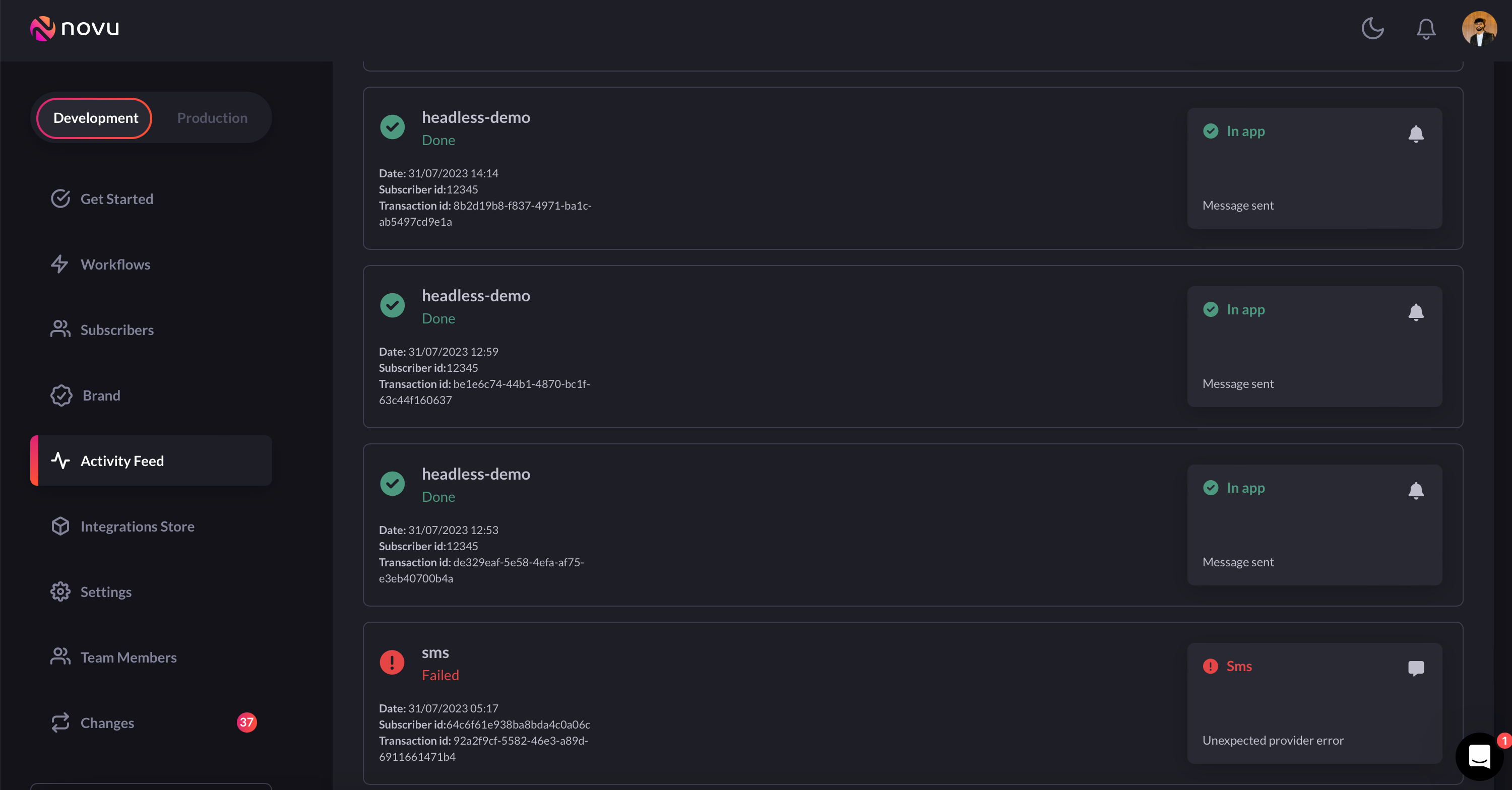 Novu provides a notification activity feed that monitors every outgoing message associated with its relevant metadata. This can be used to monitor activity and discover potential issues with a specific provider or channel type.