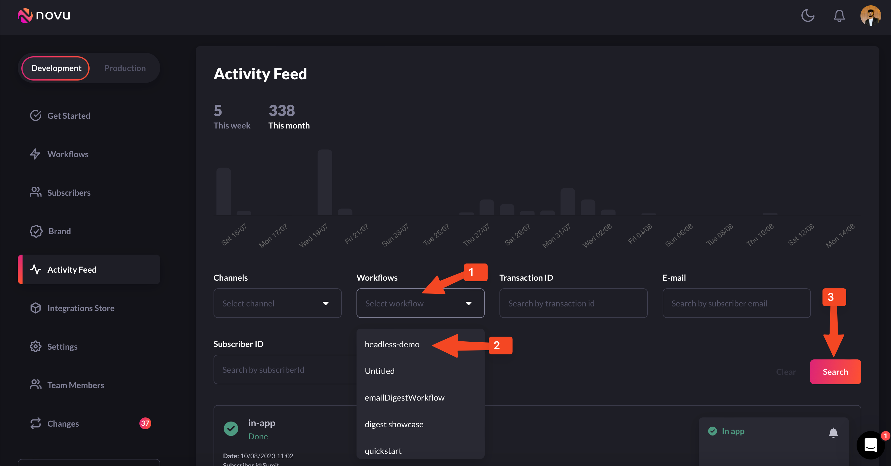 The activity feed allows you to filter messages based on the associated workflow or channel. This is helpful when you want to assess or debug a particular workflow and its behaviour. Filtering by workflow or channel is quite simple. Just go to the Workflow dropdown (if you want to filter by workflow) or the channel tab (if you want to filter by channel) and select the corresponding workflow or channel and click the ‘search’ button on the right-hand side as shown in the image below: