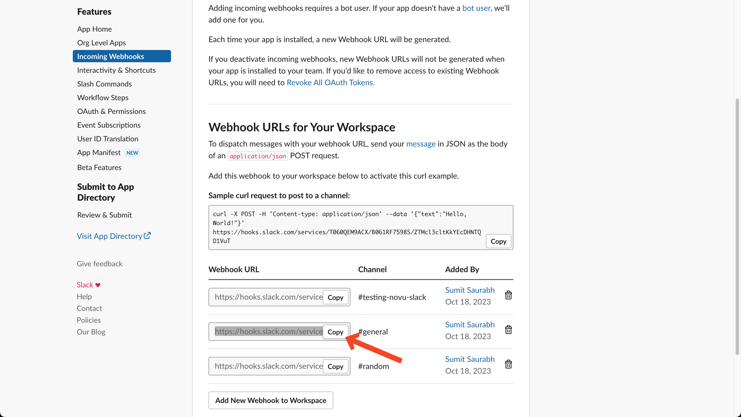Add to Slackbutton or use theShareable URLdirectly, in the application you’ll be using Novu in.The network request to the ‘Shareable URL’ will happen when the user clicks the ‘Add to Slack’ button. - This is to request permission for access (scope: incoming-webhook).