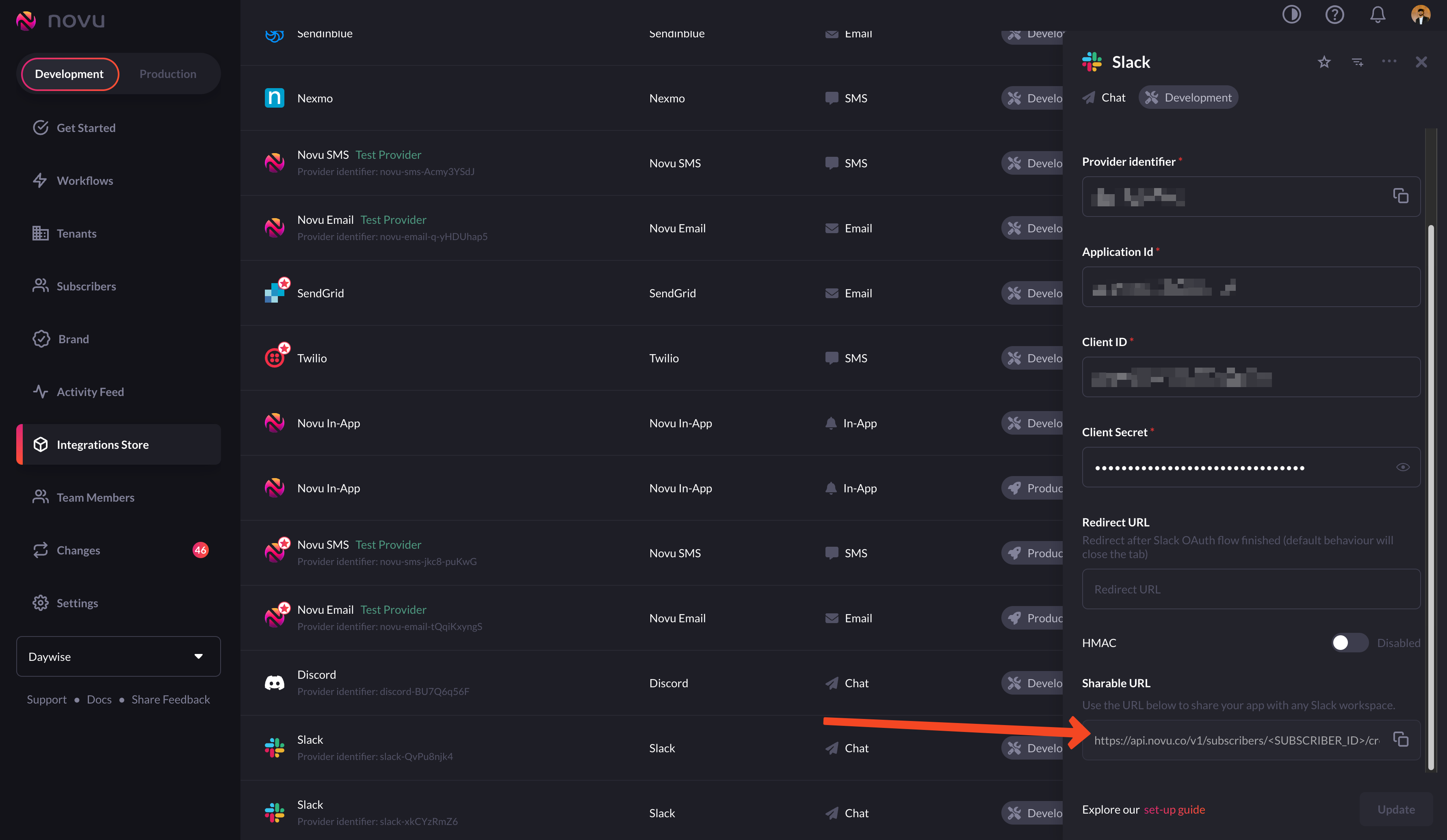 SUBSCRIBER_IDis a custom identifier used when identifying your users within the Novu platform.ENVIRONMENT_IDis a context of an environment you can locate your environment id in the setting in the dashboard settings.PROVIDER_ID(optional) is a unique identifier of the integration and is required when you have multiple slack integrations in Novu. You can locate your integration identifier in the Integration Store. When not provided, the last created integration will be used. If you are using theAdd to Slackbutton you have to provide theShareable URLas theredirect_uriparameter like in this example. Make sure that theShareable URLis URL encoded:
