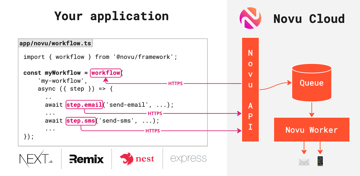 Novu Framework introduces a new paradigm when working with Novu. Rather than defining workflows and templates at Novu Cloud, Novu Framework enables you to work in your application, use your own libraries and connect to your production environment during workflow execution over HTTPS. The Novu Framework exports the client you use to define and serve your workflows and their steps over HTTPS. The workflows can be added to your preferred framework. During workflow execution Novu Cloud makes HTTPS requests to your Bridge server for just-in-time Content and Subscribers resolution.