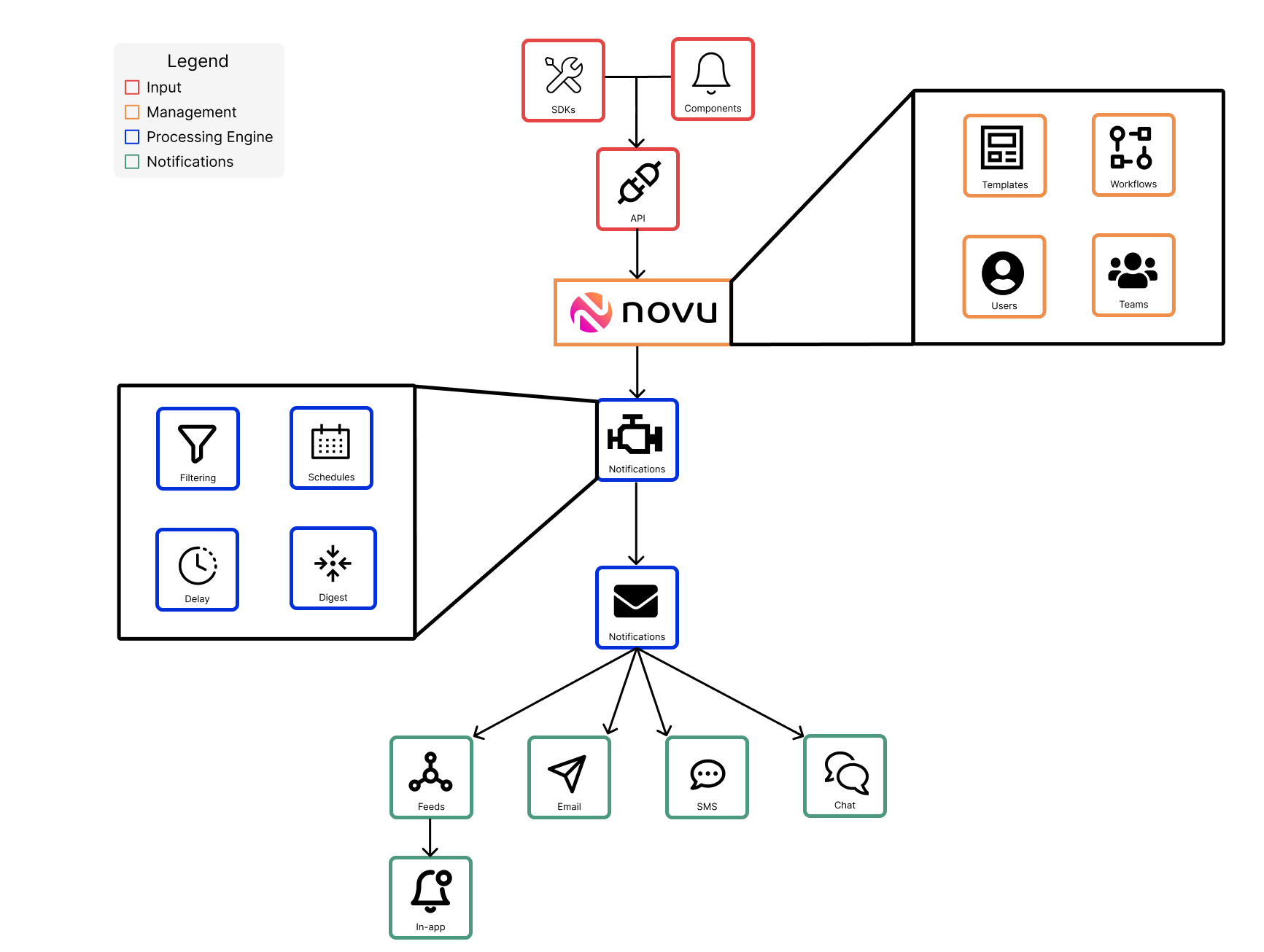 Skip to main contentNovu comprises two fundamental components: an API for data exchange and a dashboard for designing notifications and their accompanying logical rules.