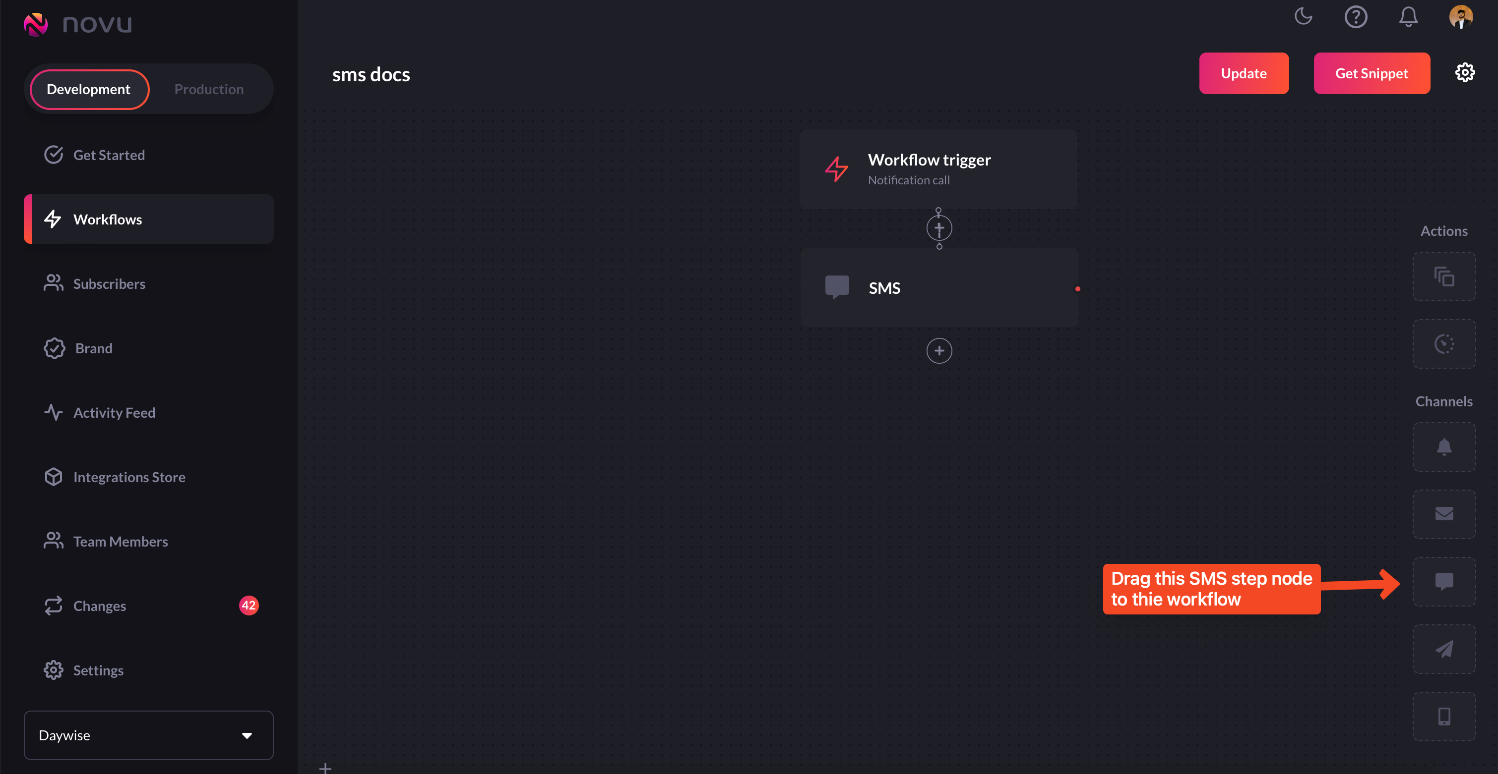 Since we’re creating a workflow for SMS notifications, we’ll drag the