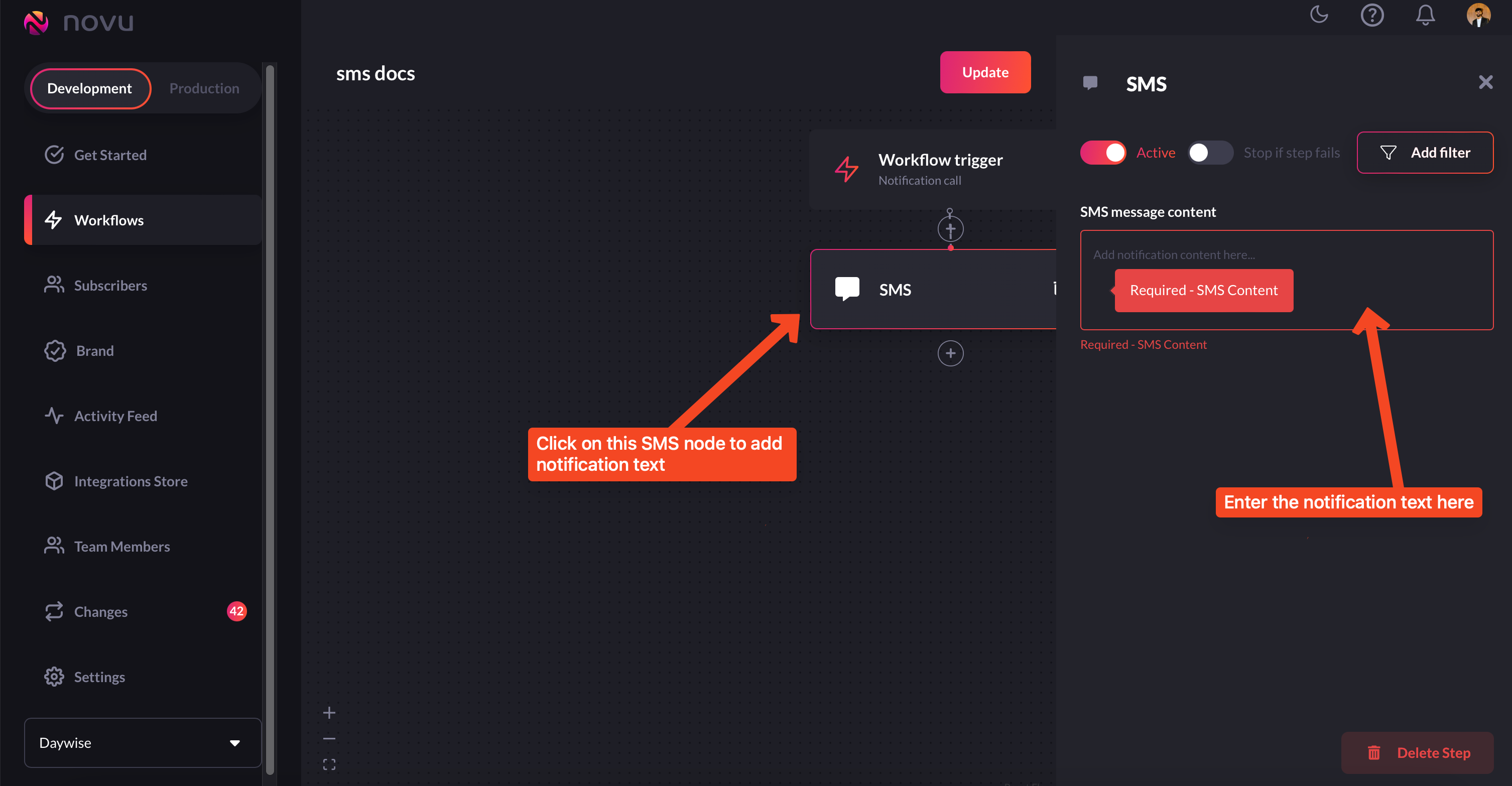If you hover over the SMS node, you will get a message saying ‘Required - SMS content`. Click on the SMS node and add a message to it. This is what will be sent as a notification in the SMS.