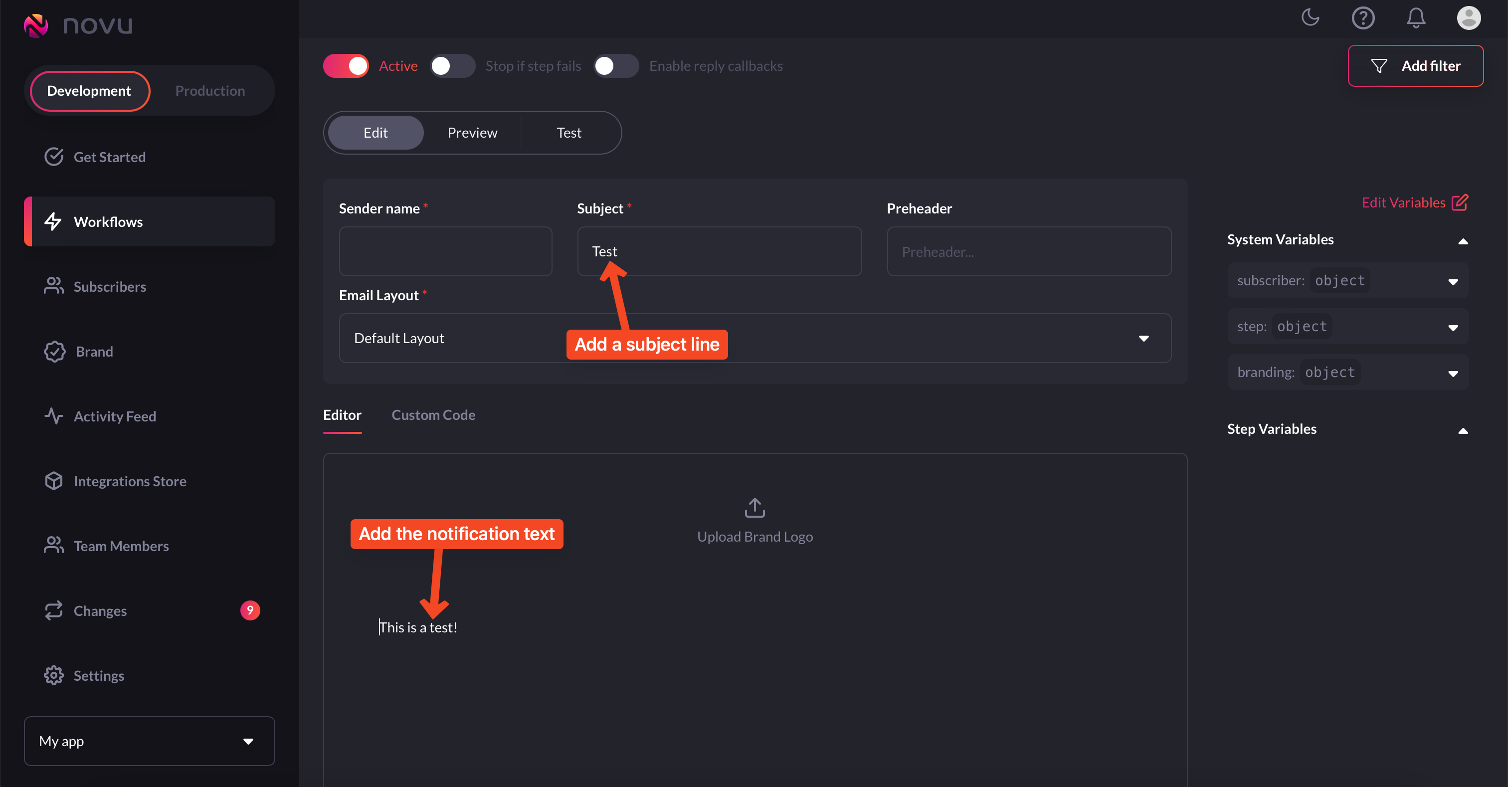 Enter either the static notification text, or send dynamic notifications using variables and handlebar helpers