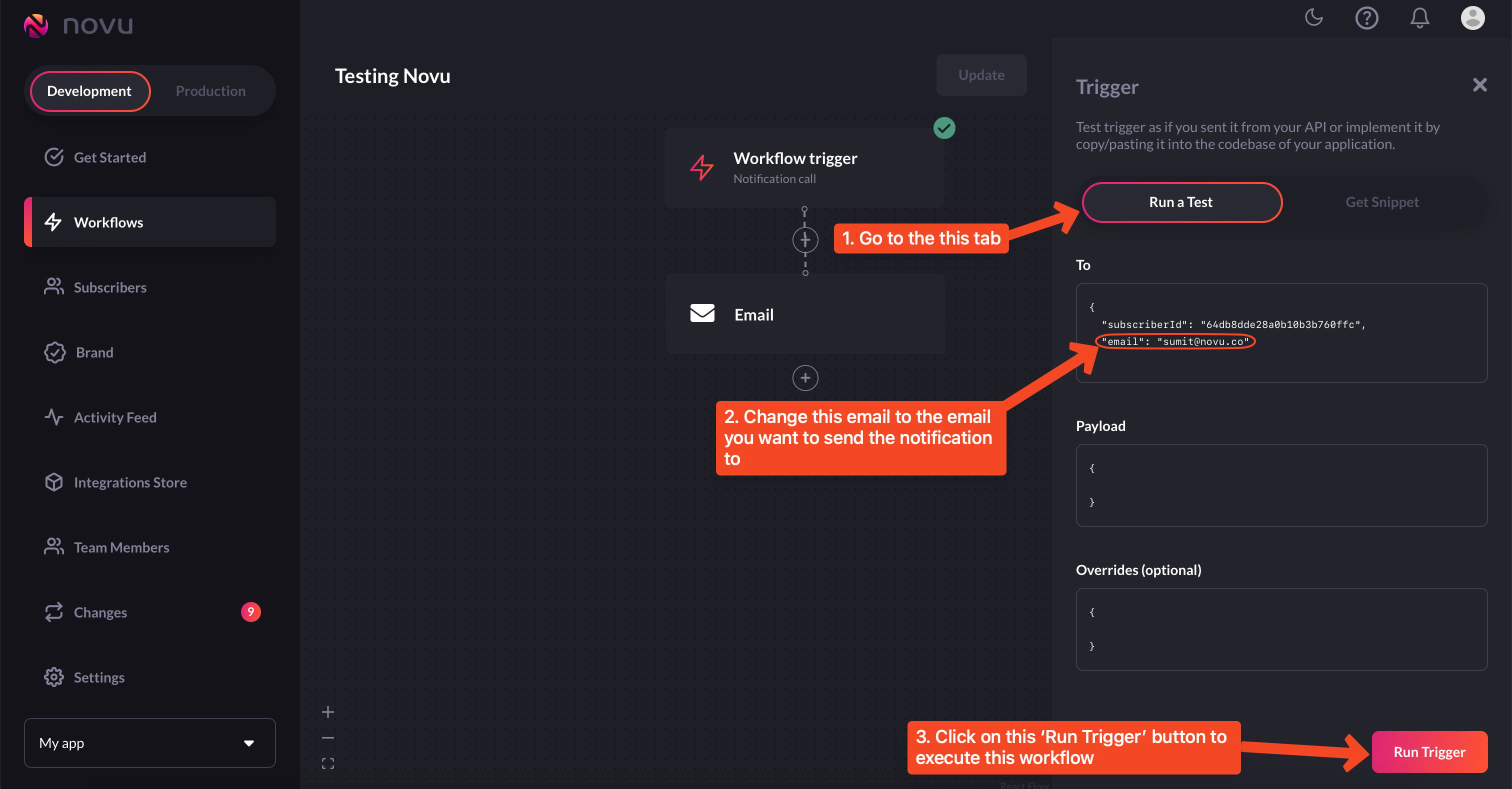 run a testtab, you can change the email to which you want the notification. Once you’ve done that, simply click on theRun Triggerbutton on the bottom right: