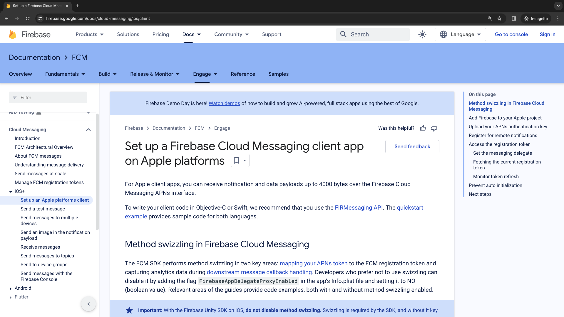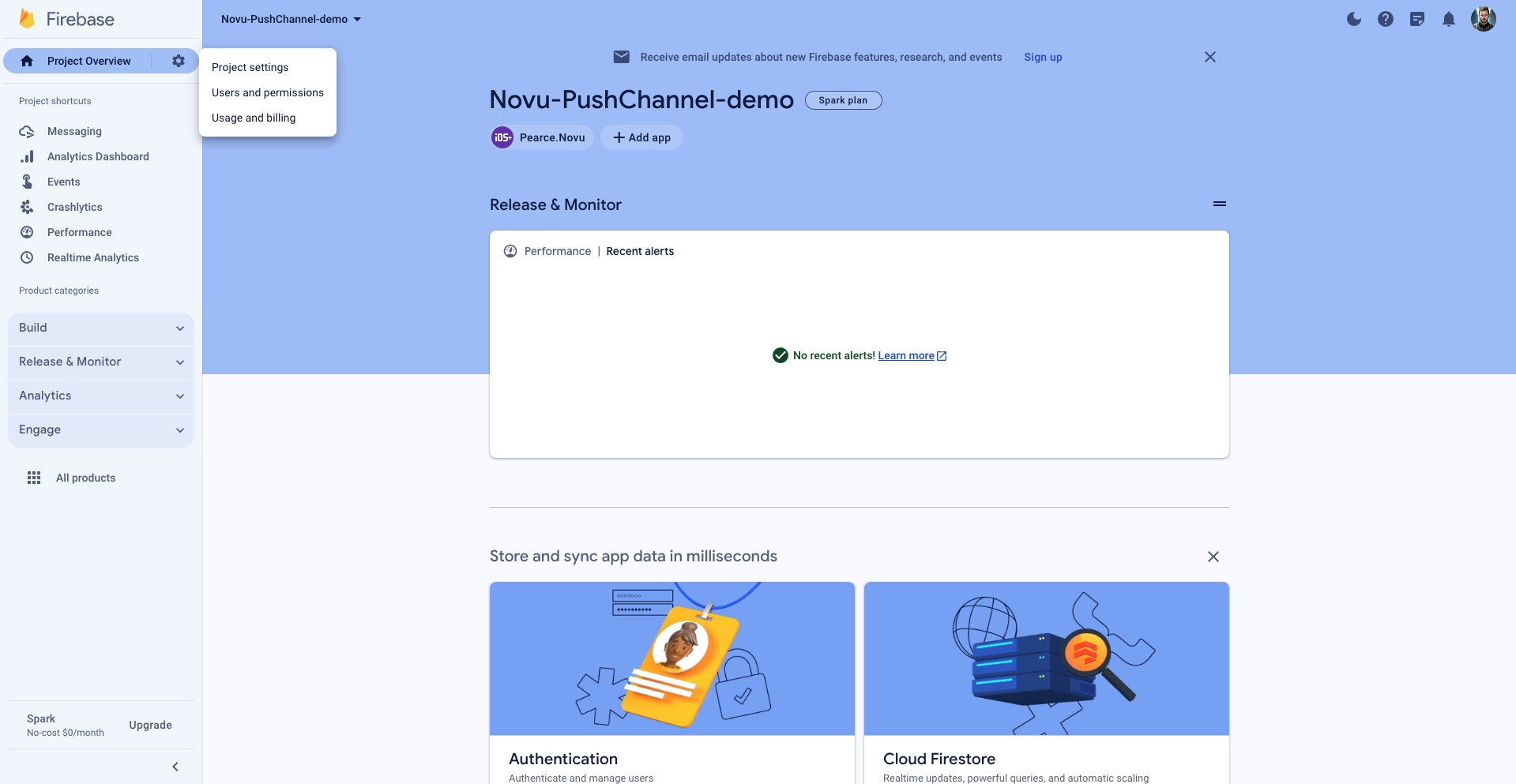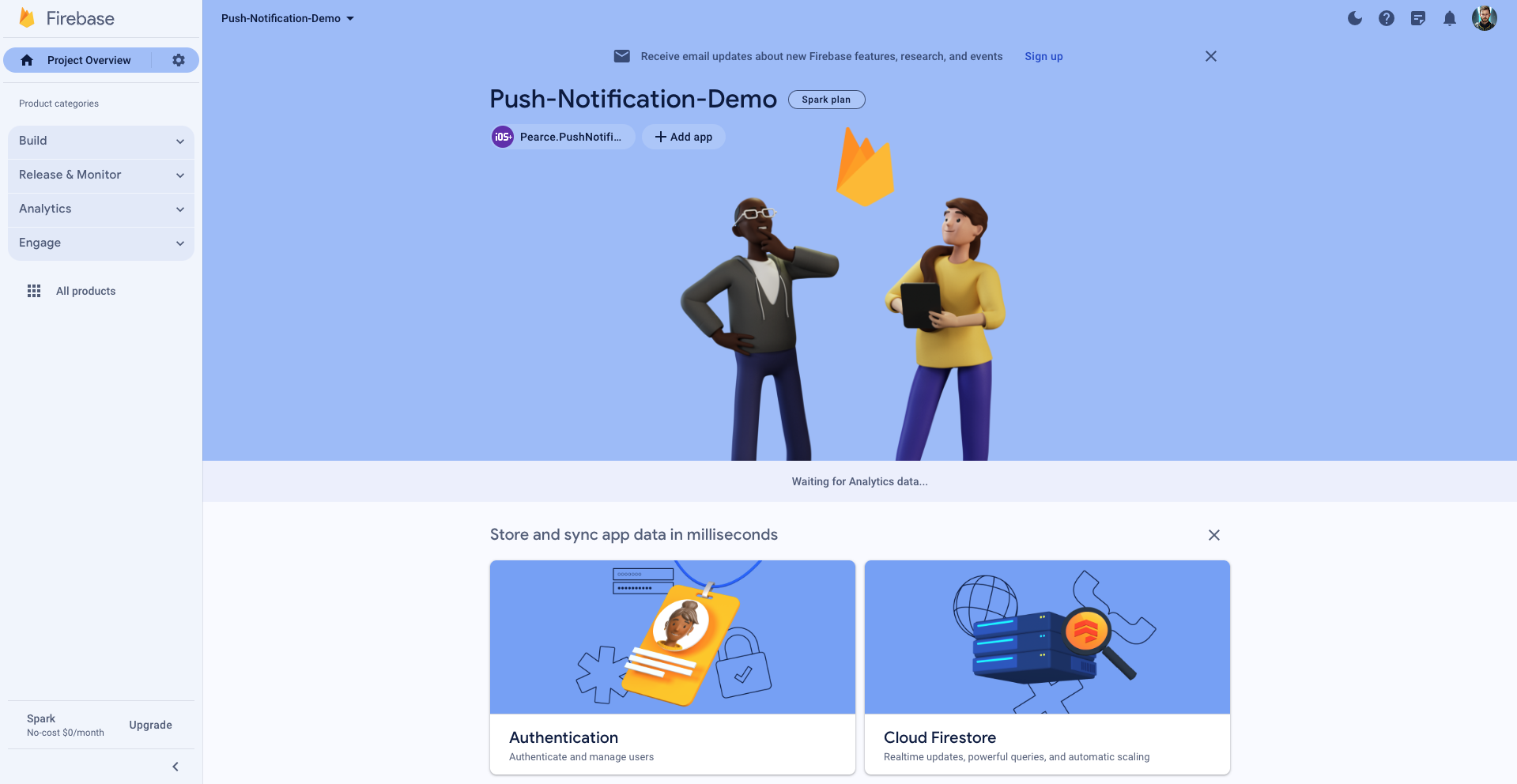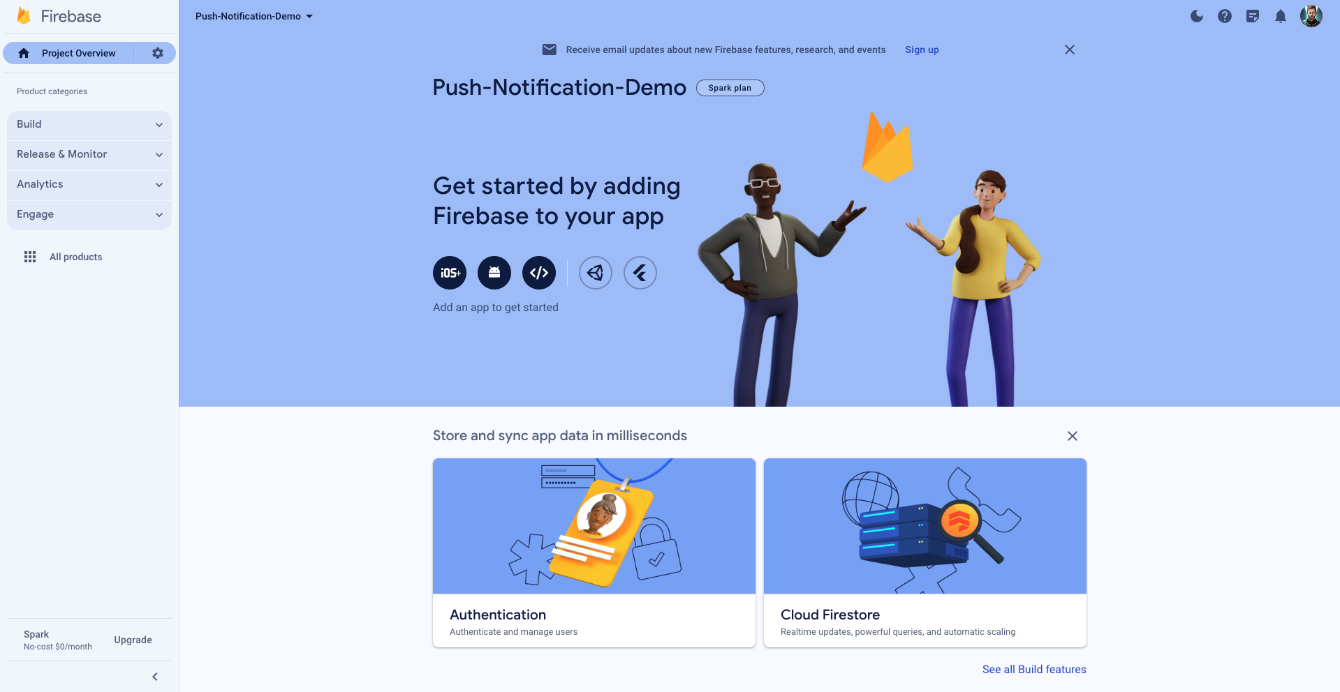 In your Firebase project, navigate to ‘engage’ section and click on ‘messaging’.
