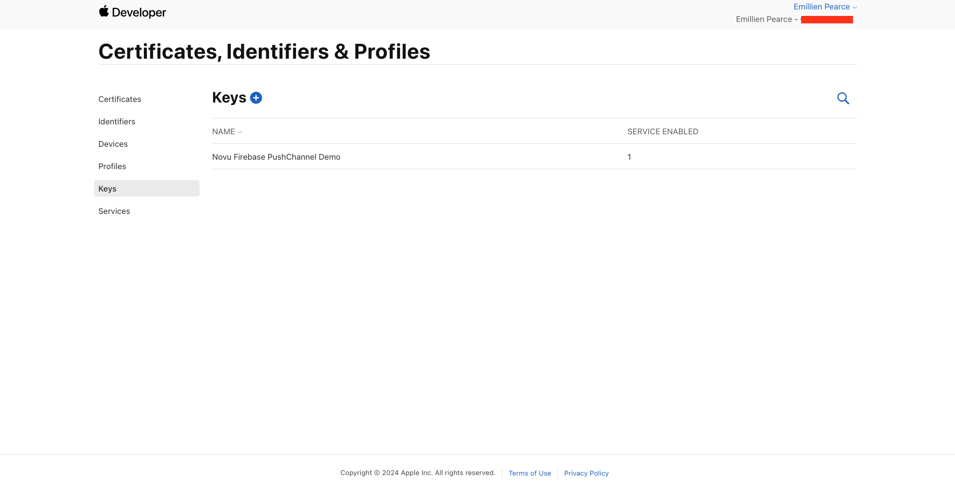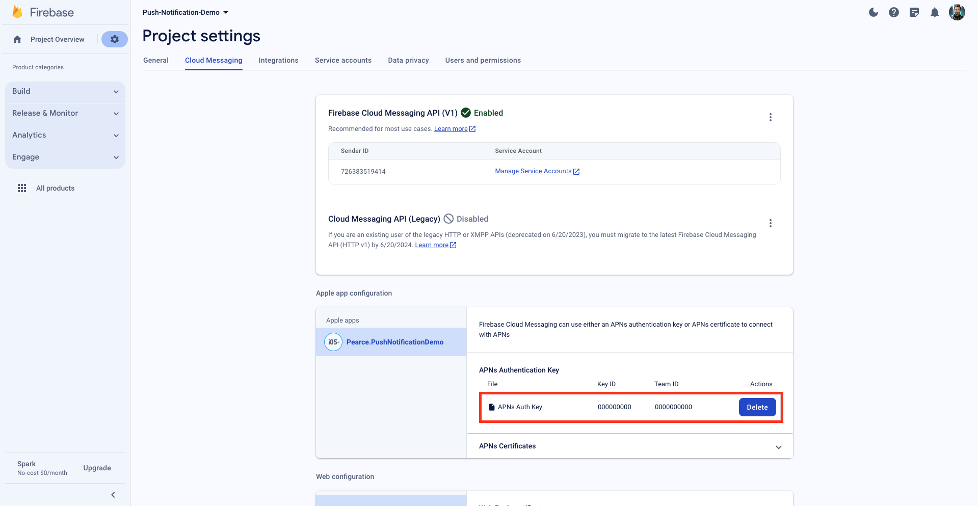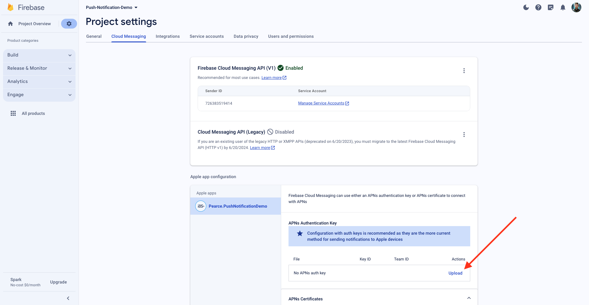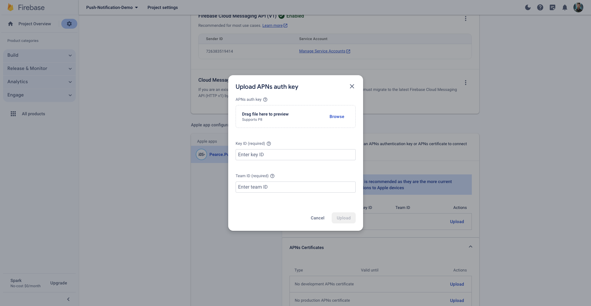 We will create and upload our APNs authentication key to the Firebase project settings.