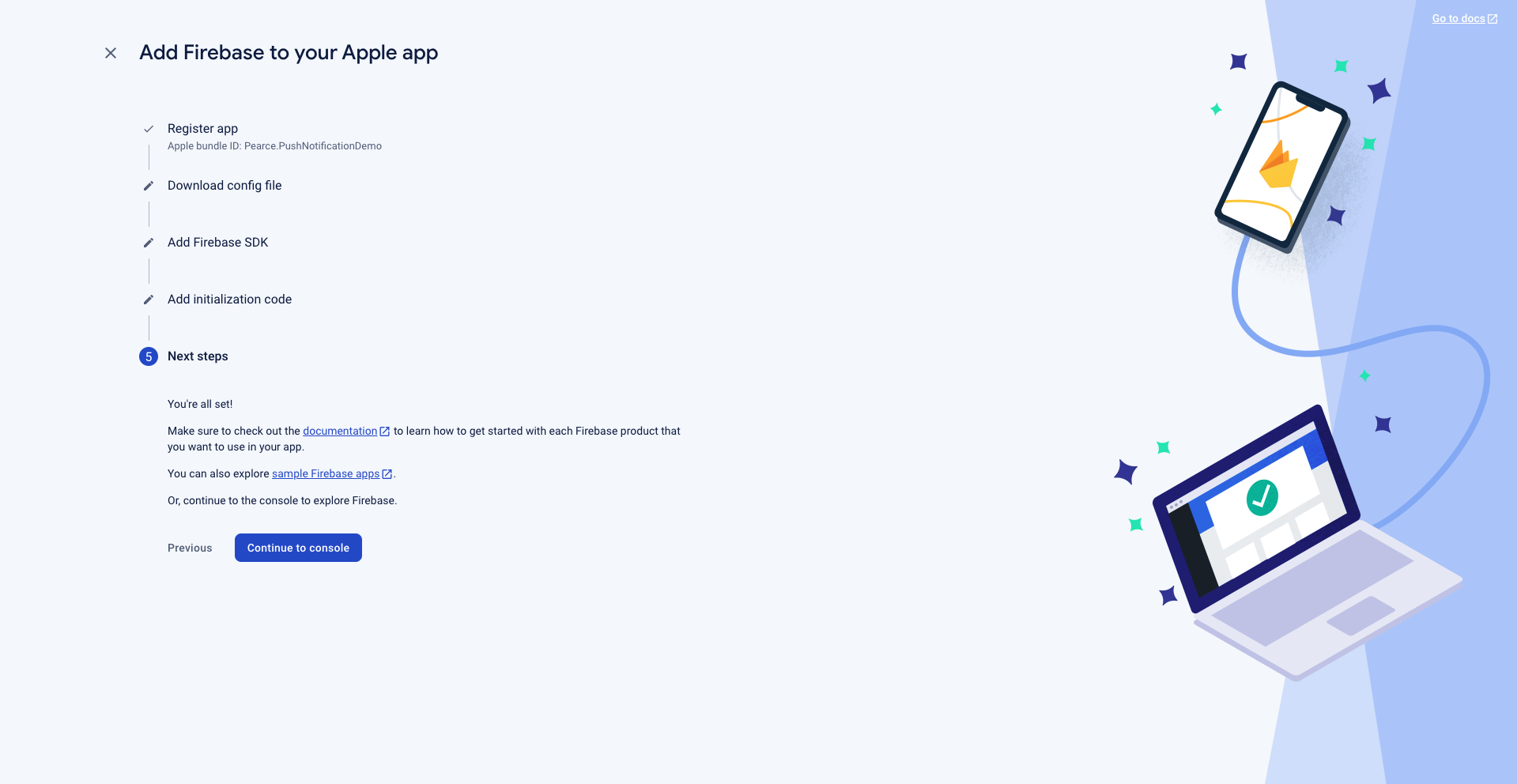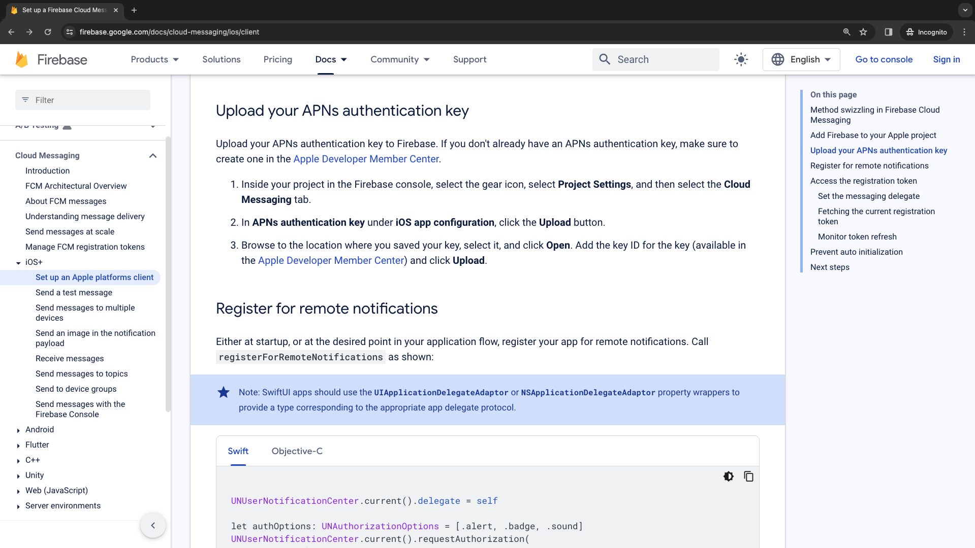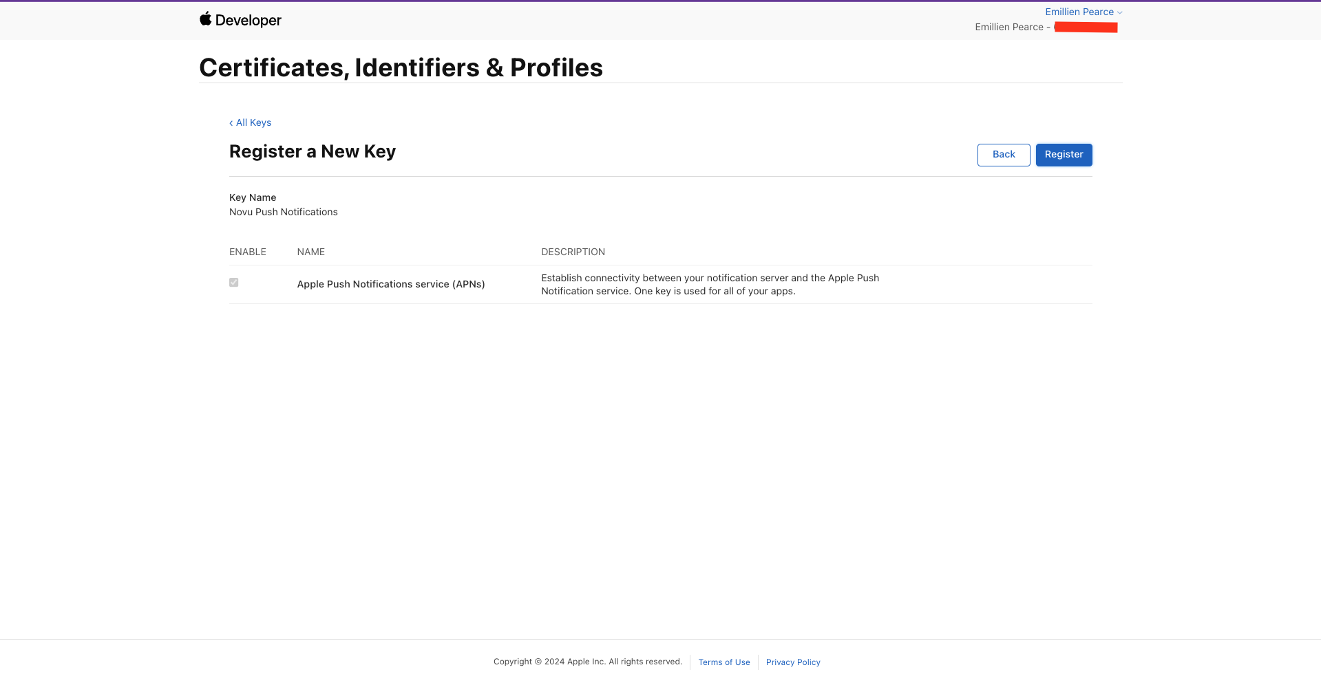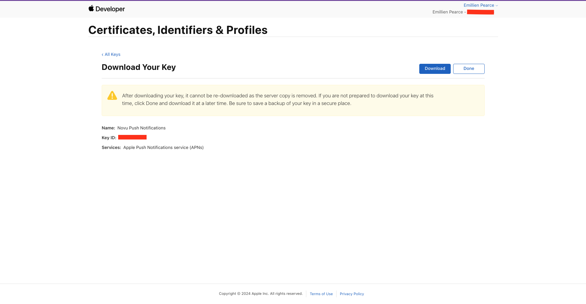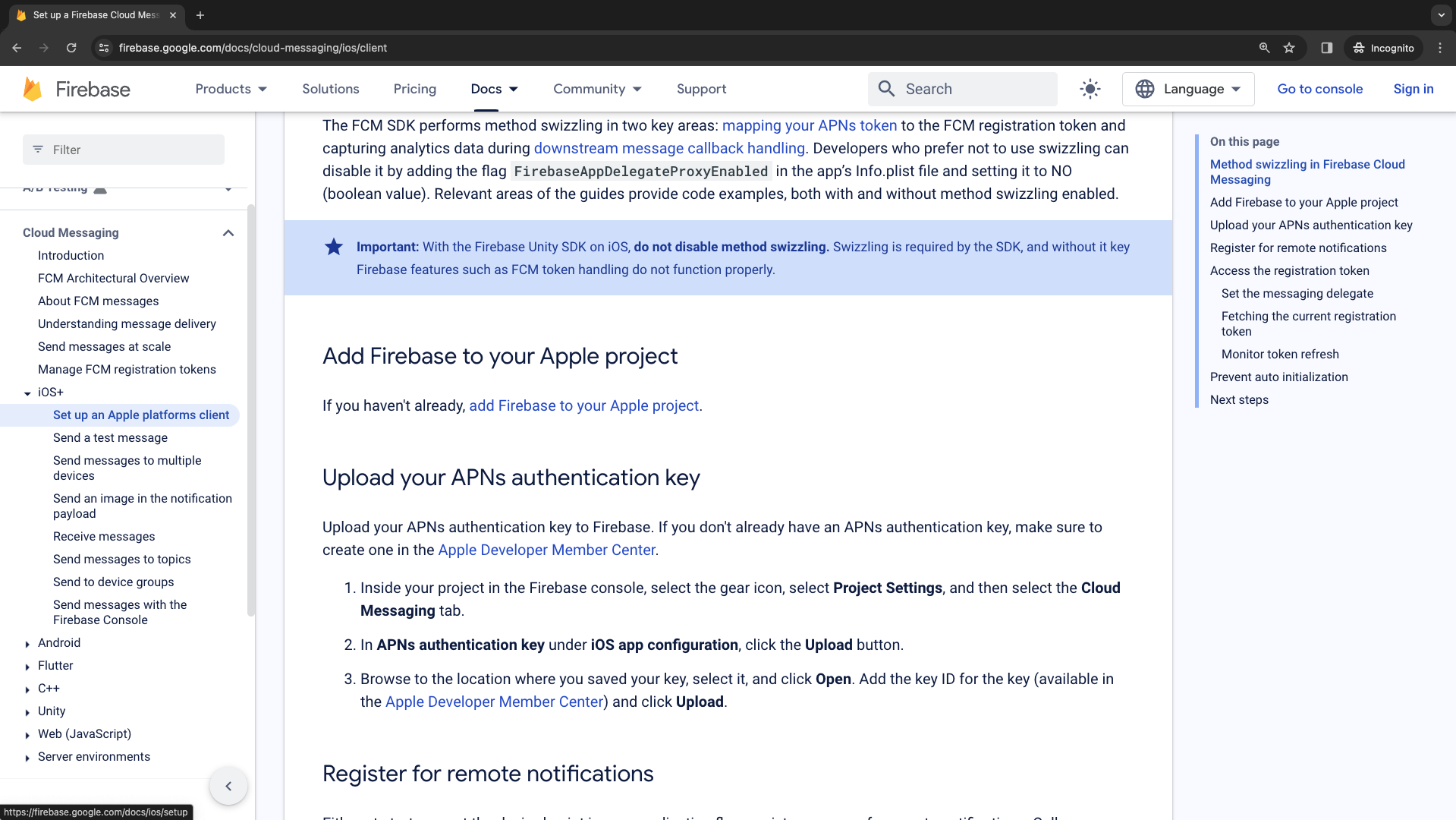 We will create and upload our APNs authentication key to the Firebase project settings.
