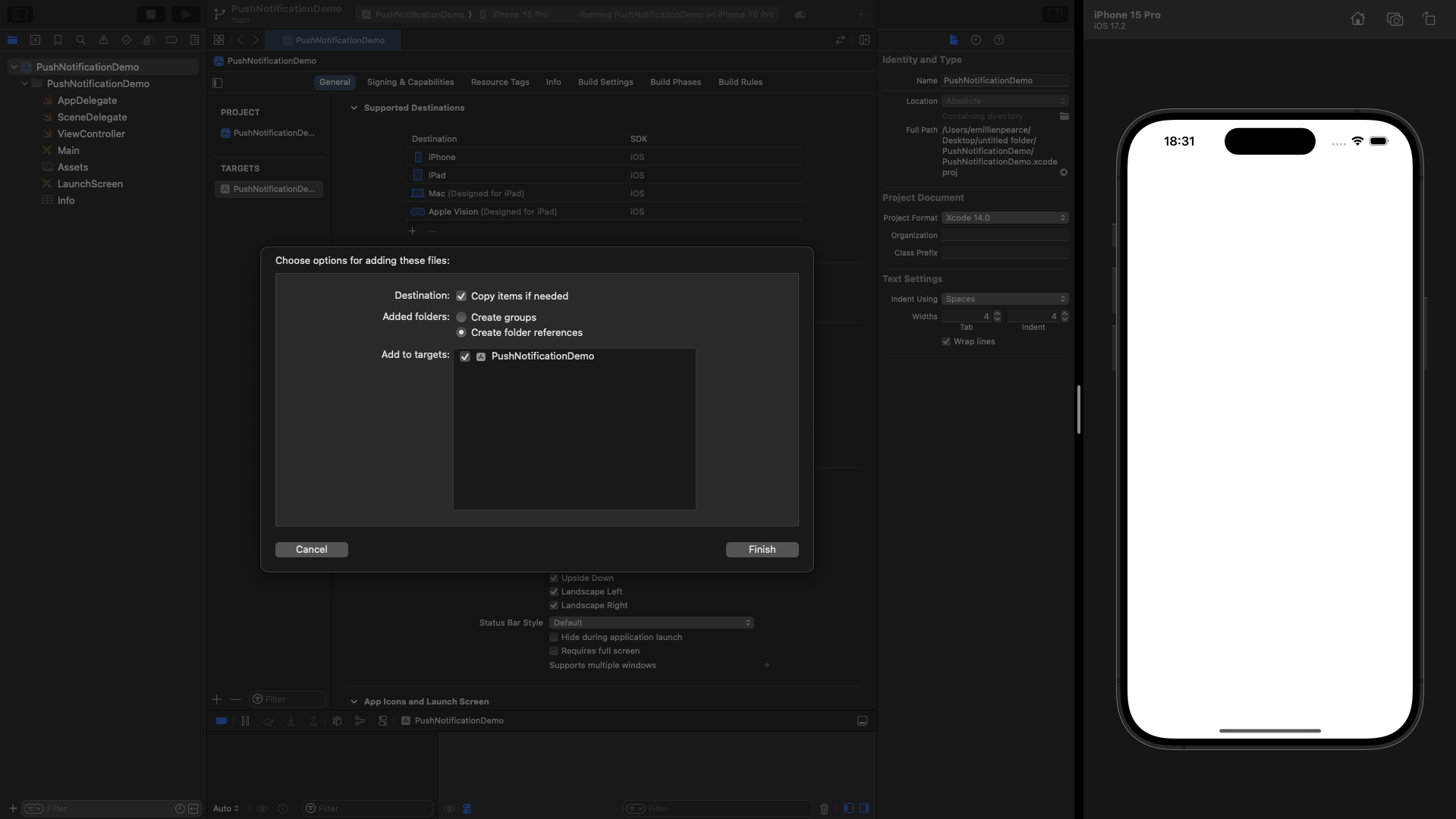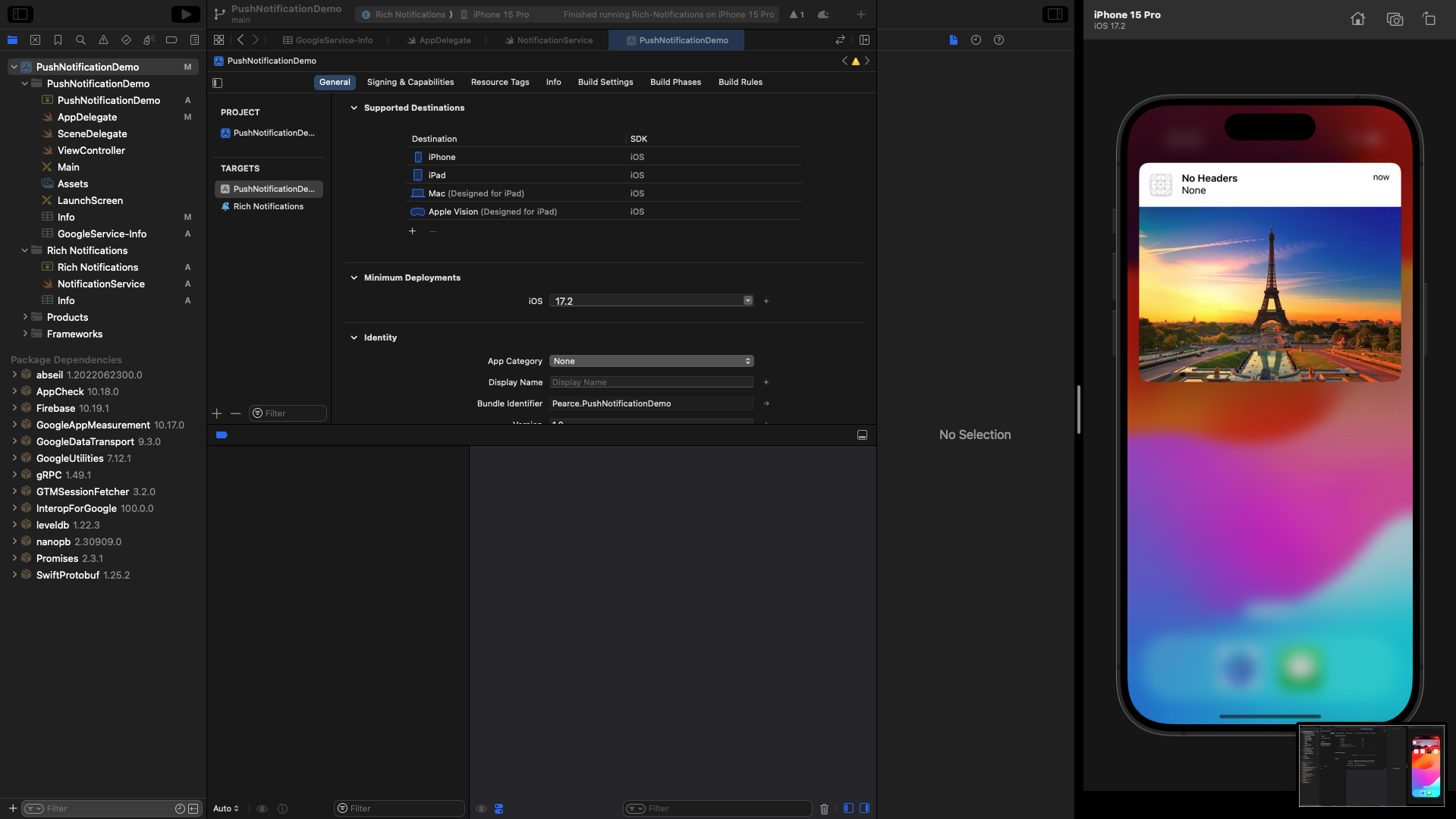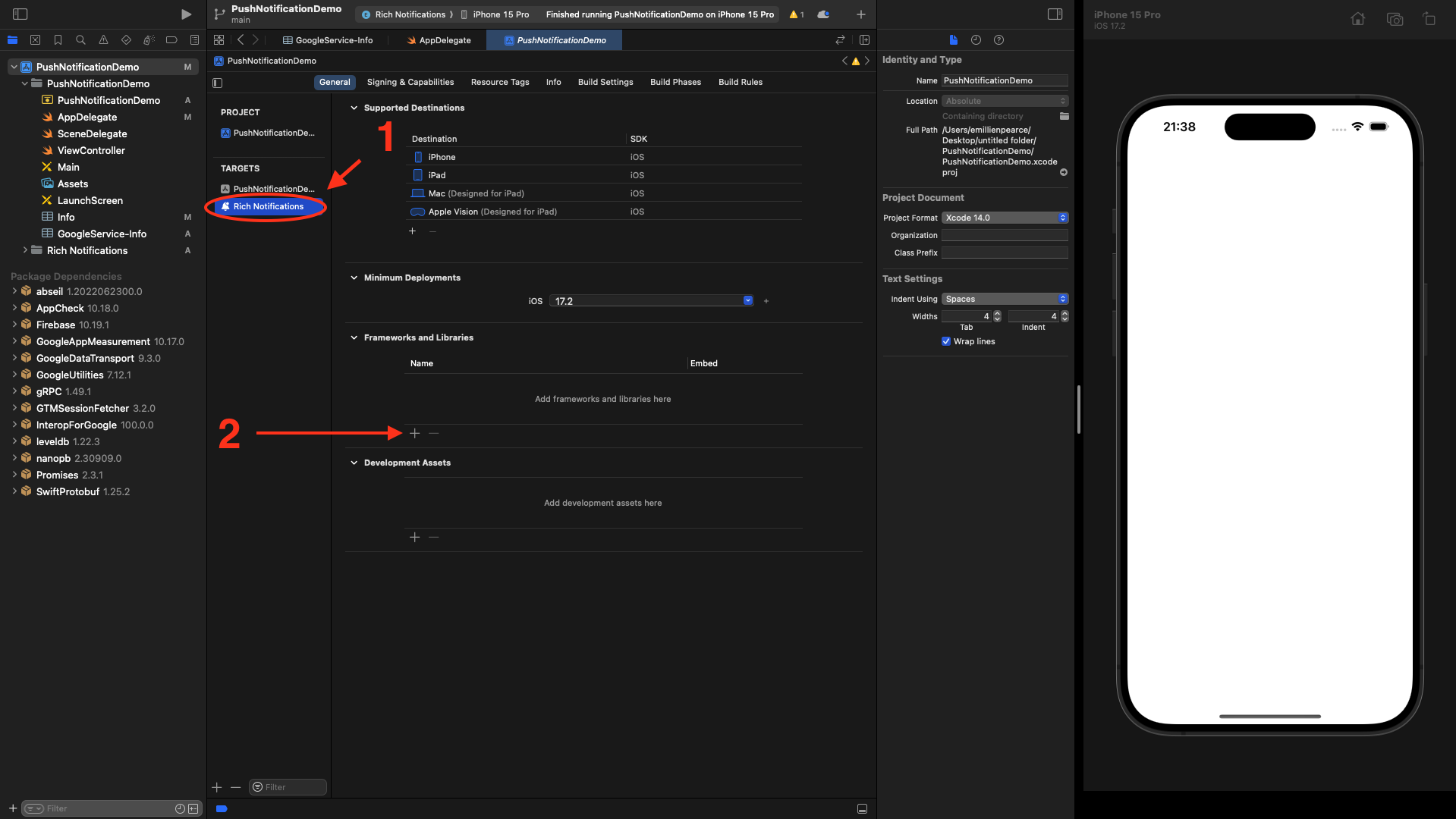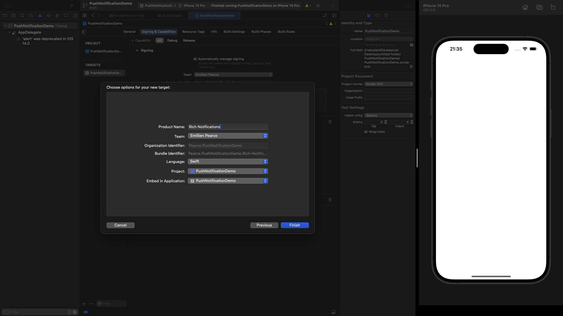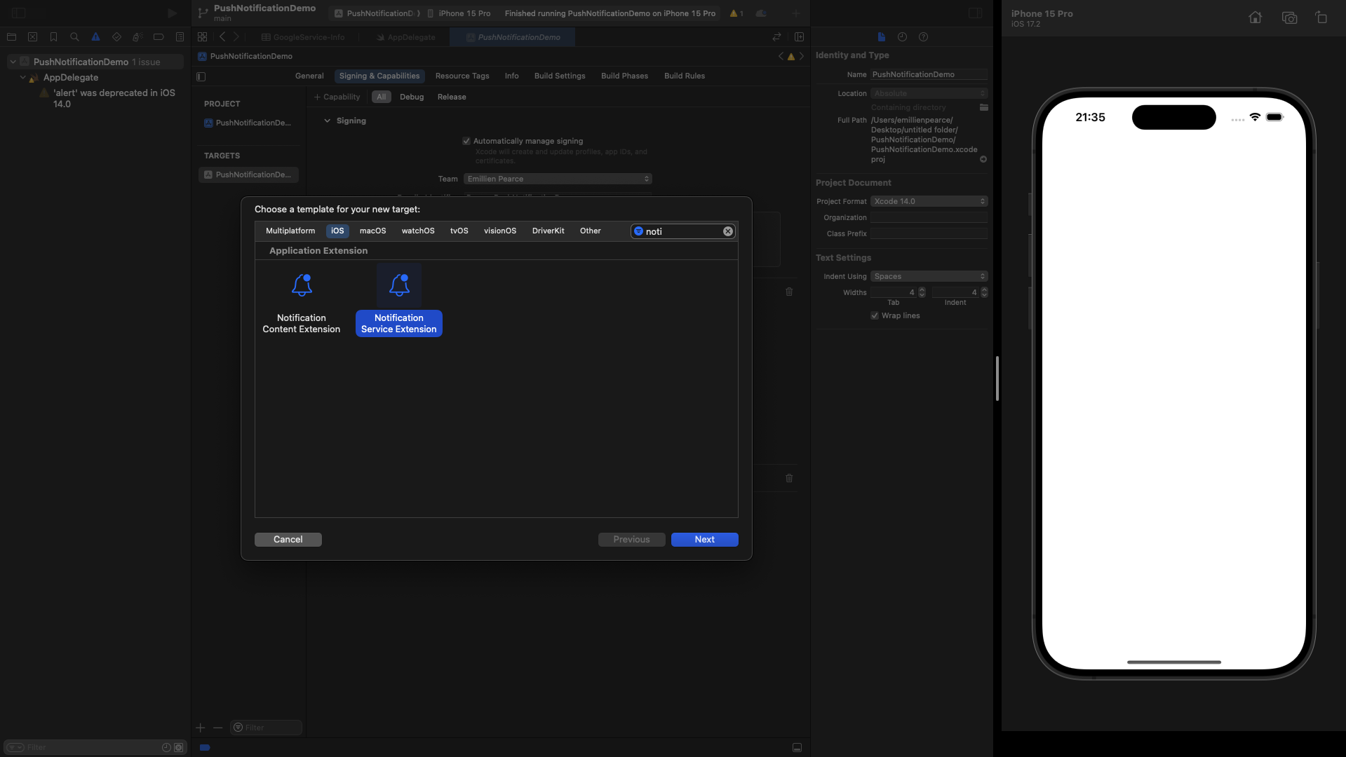 Up to this point, your notifications have all contained only text. But if you’ve received many notifications, you know that notifications can have rich content, such as images. It’d be great if your notifications showed users a nice image related to their content. Once again, Firebase makes this super simple. To show an image in push notifications, you’ll need to create a Notification Service Extension. This is a separate target in your app that runs in the background when your user receives a push notification. The service extension can receive a notification and change its contents before iOS shows the notification to the user. You’ll use Firebase to send an image URL inside a notification. You’ll then use a content extension to download the image and add it to the notification’s content. In Xcode, go to File ▸ New ▸ Target…. Search for Notification Service Extension and select Next. Set a name and configure it to add to your main project.