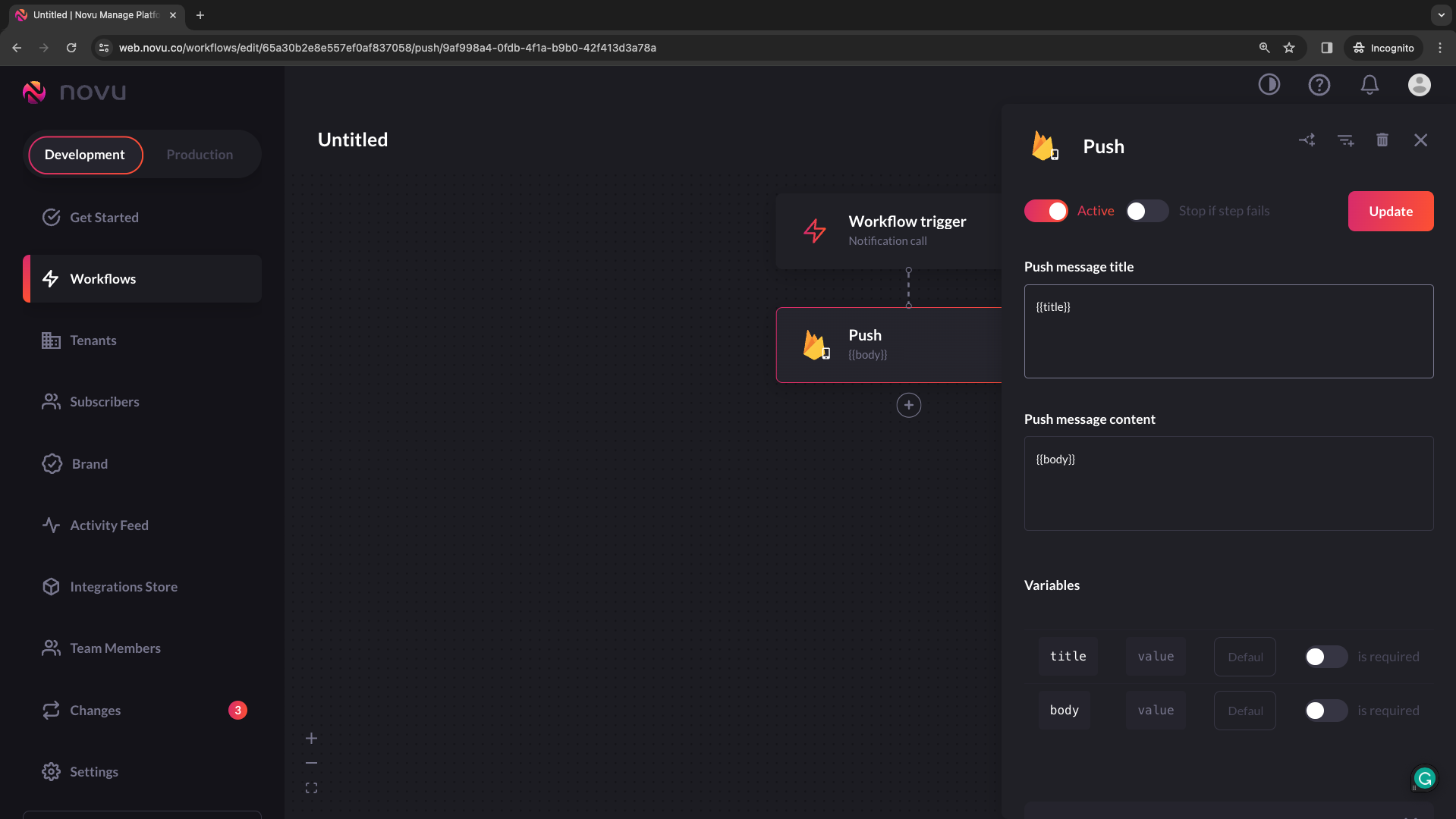 In Novu, creating a workflow means establishing a blueprint for sending notifications within your app. This unified structure ties together email, in-app messages, SMS, push notifications, and chat into one entity. Each workflow has a unique name and identifier and includes customized content for various channels, using{{handlebars}} variables for personalization.