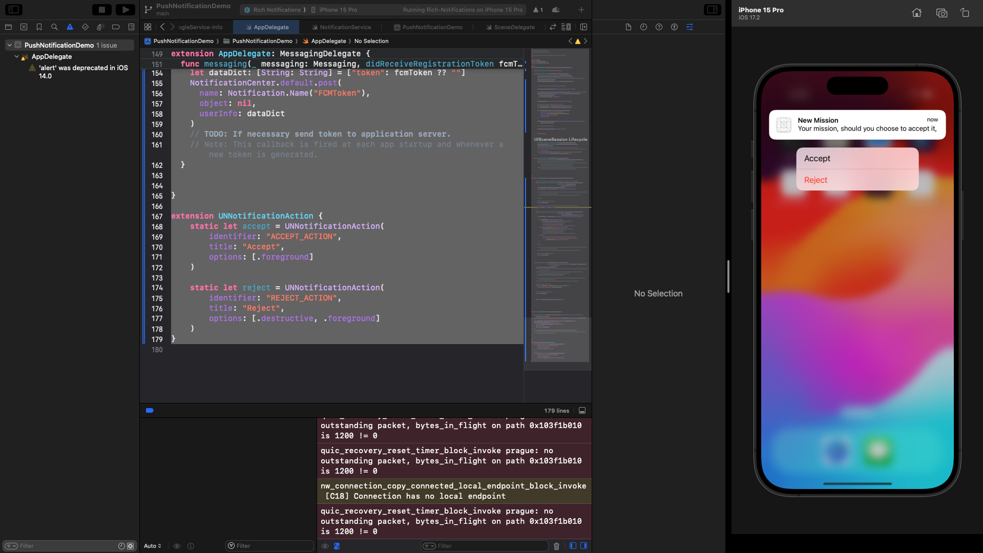 AppDelegateextension at the bottom forUNUserNotificationCenterDelegate. -