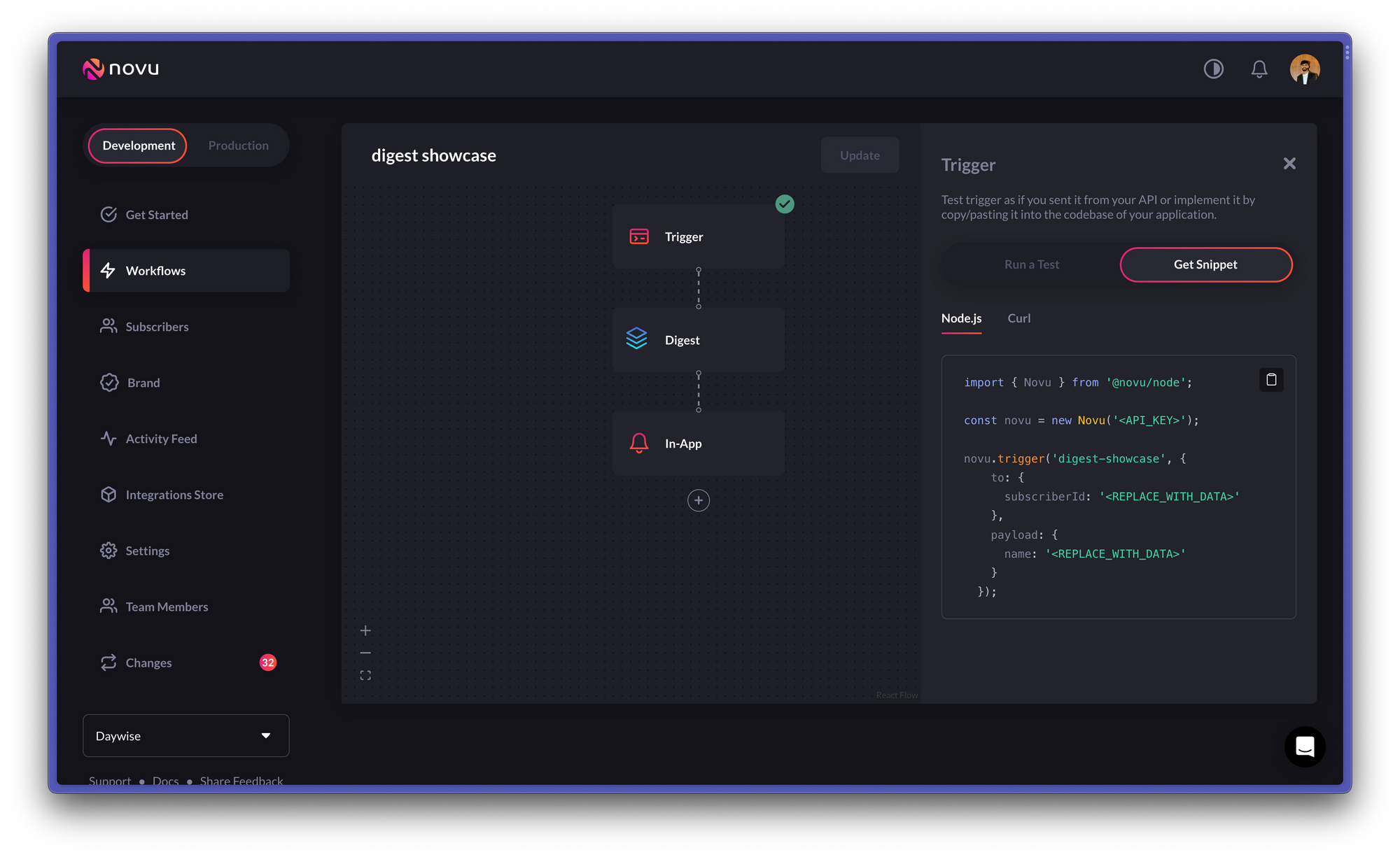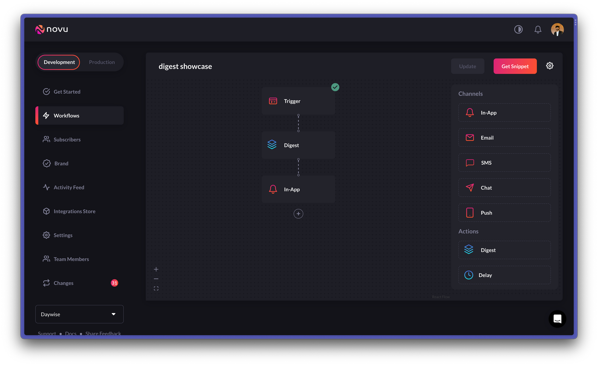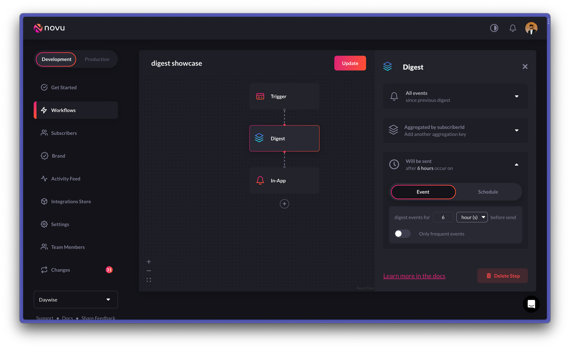 Novu has a built-in digest engine that collects multiple trigger events, aggregates them into a single message and delivers it to the subscriber. You can use the digest engine by adding adigest node to your workflow in the workflow editor in the Novu dashboard.