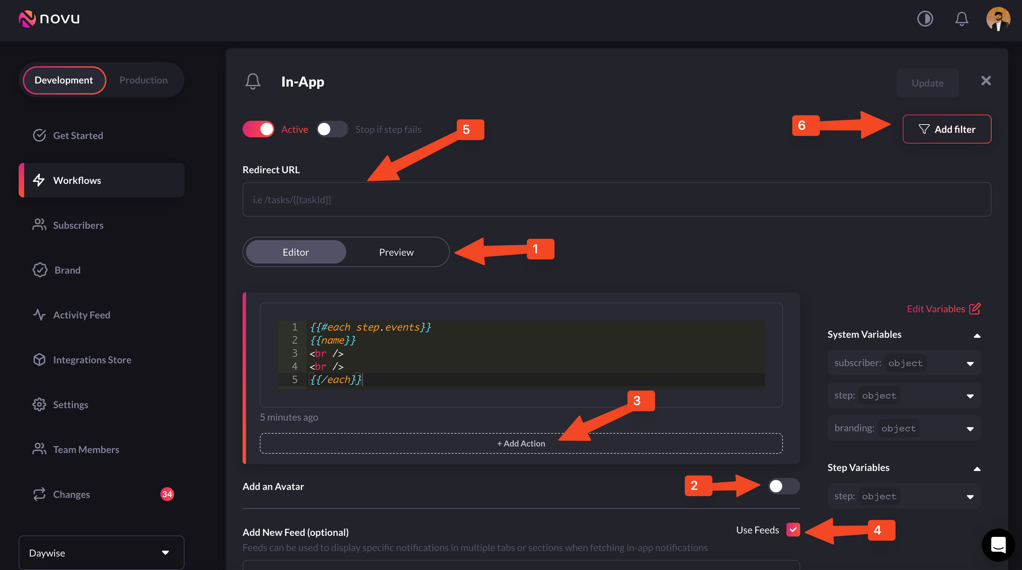 - 6-Filter - This feature allows you to configure the criteria for delivering notifications. For instance, you can apply a filter based on a subscriber’s online status to send them an email if they were online within the last hour.