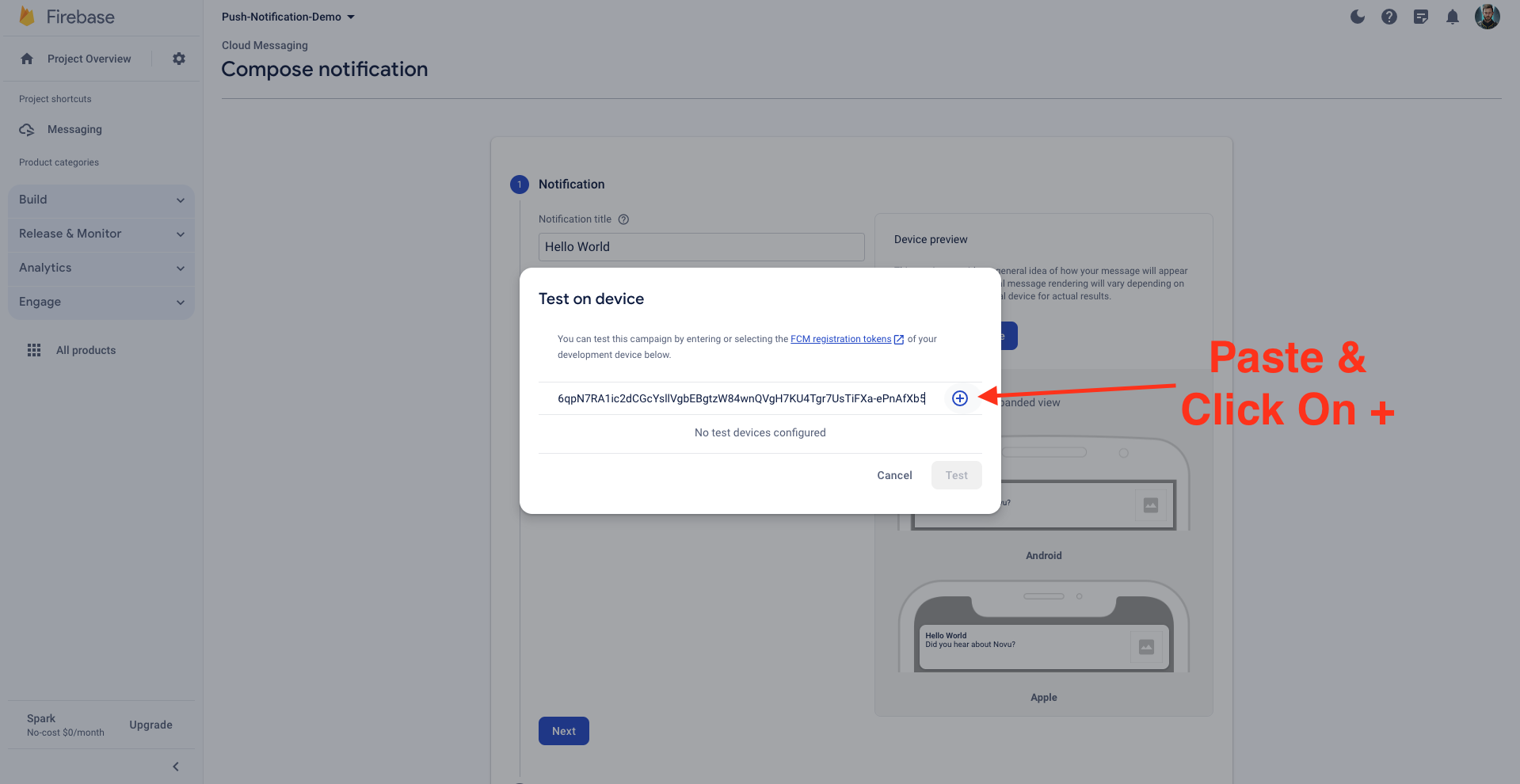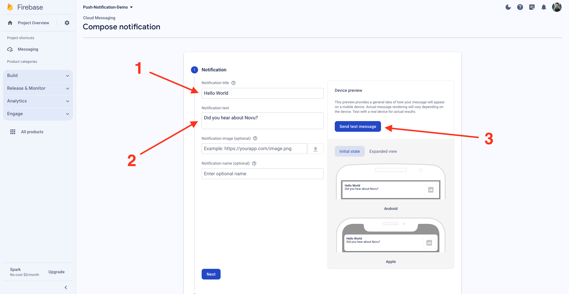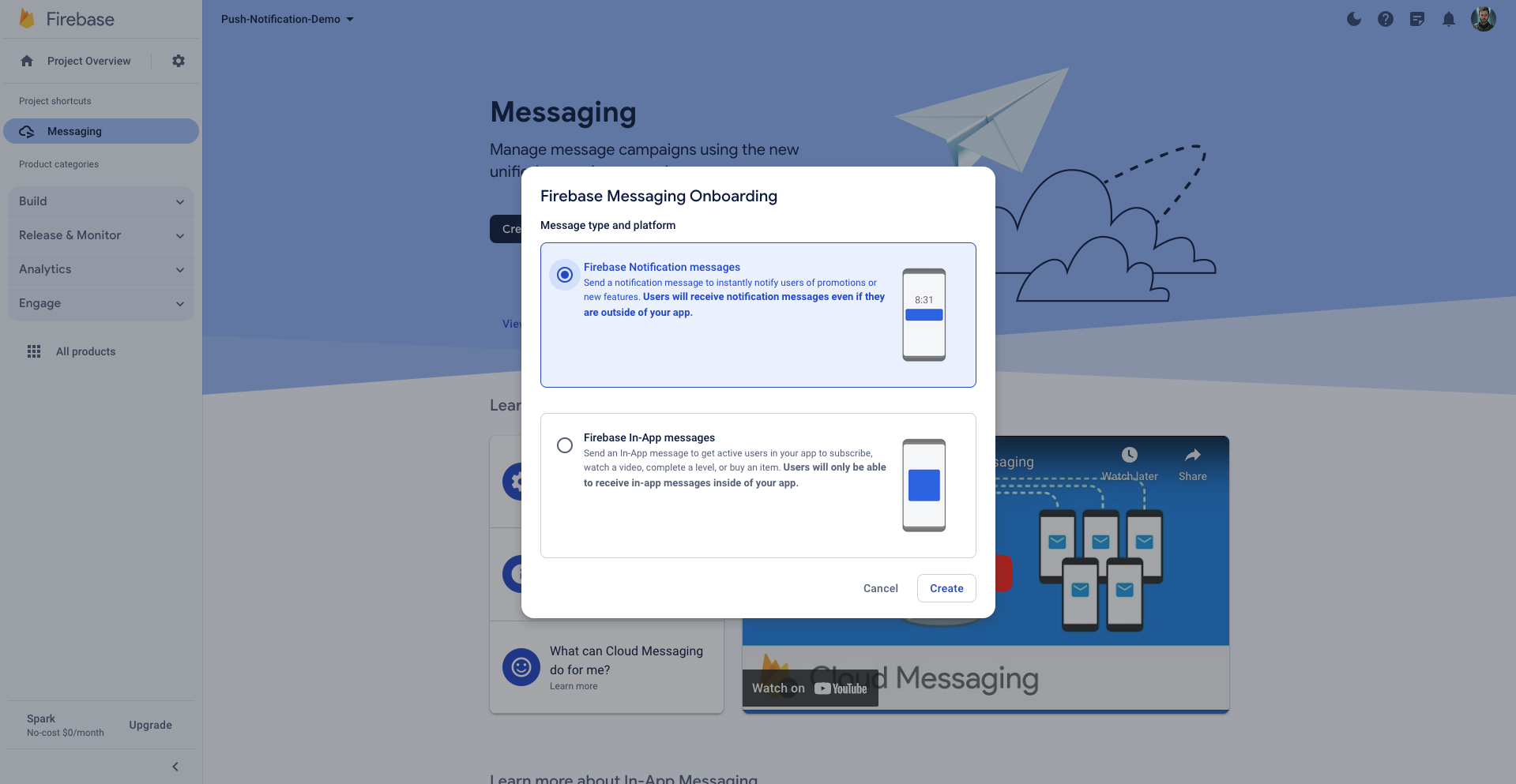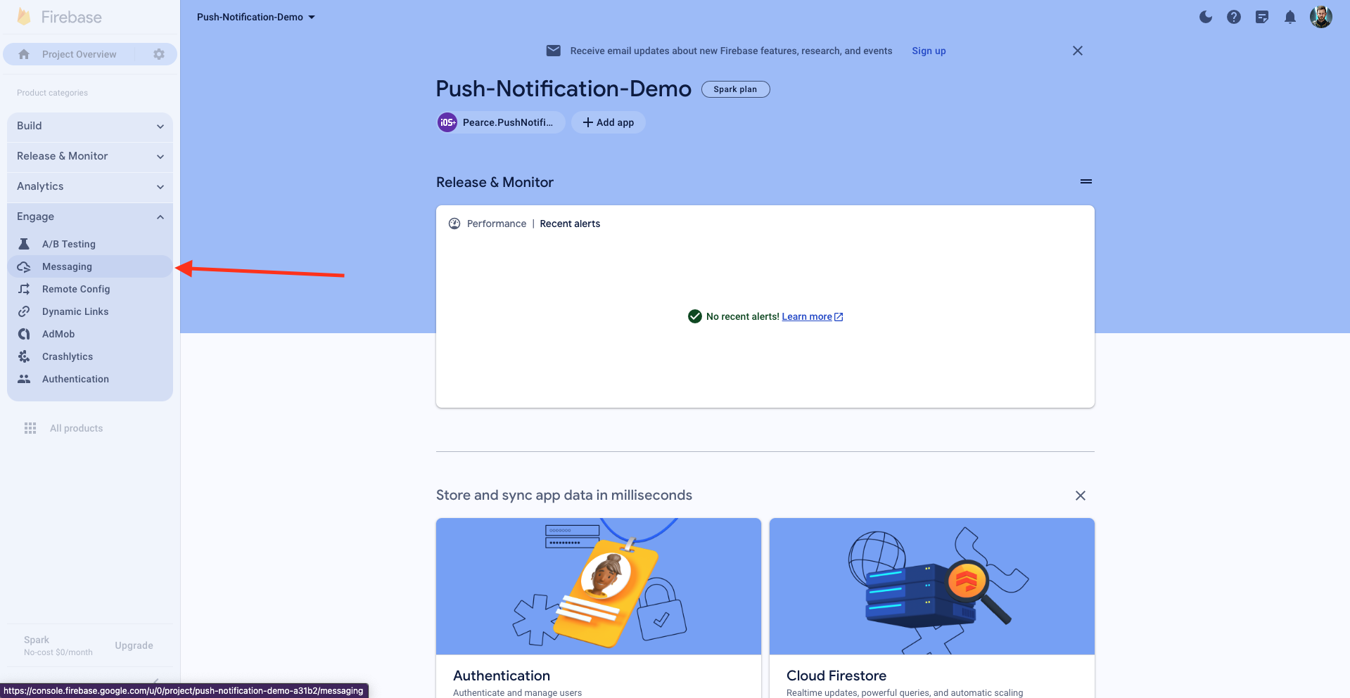 In your Firebase project, navigate toEngage section and click on Messaging.
