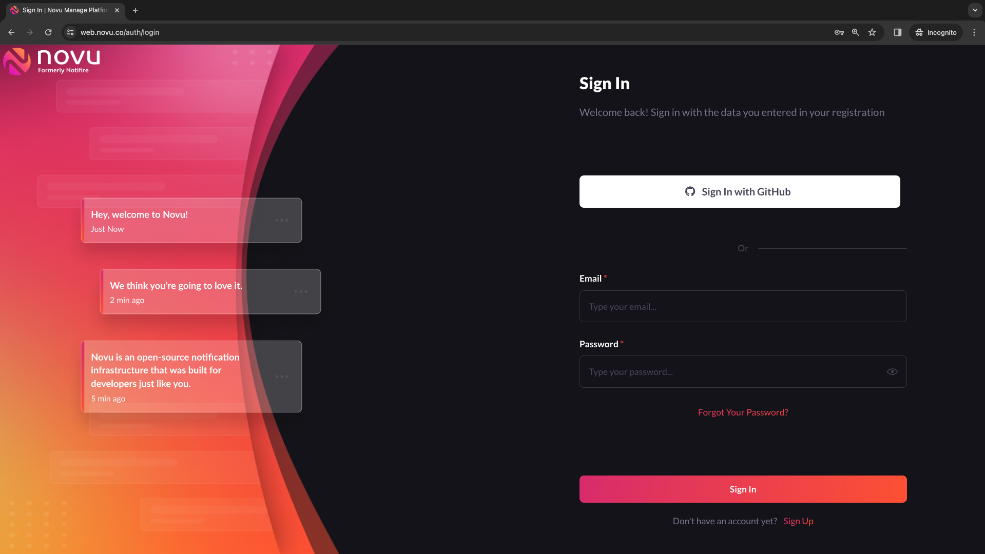 Let’s use Novu to fire push notifications via FCM. First, sign up on Novu Cloud?utm_campaign=docs-gs-guides-fc-flutter.