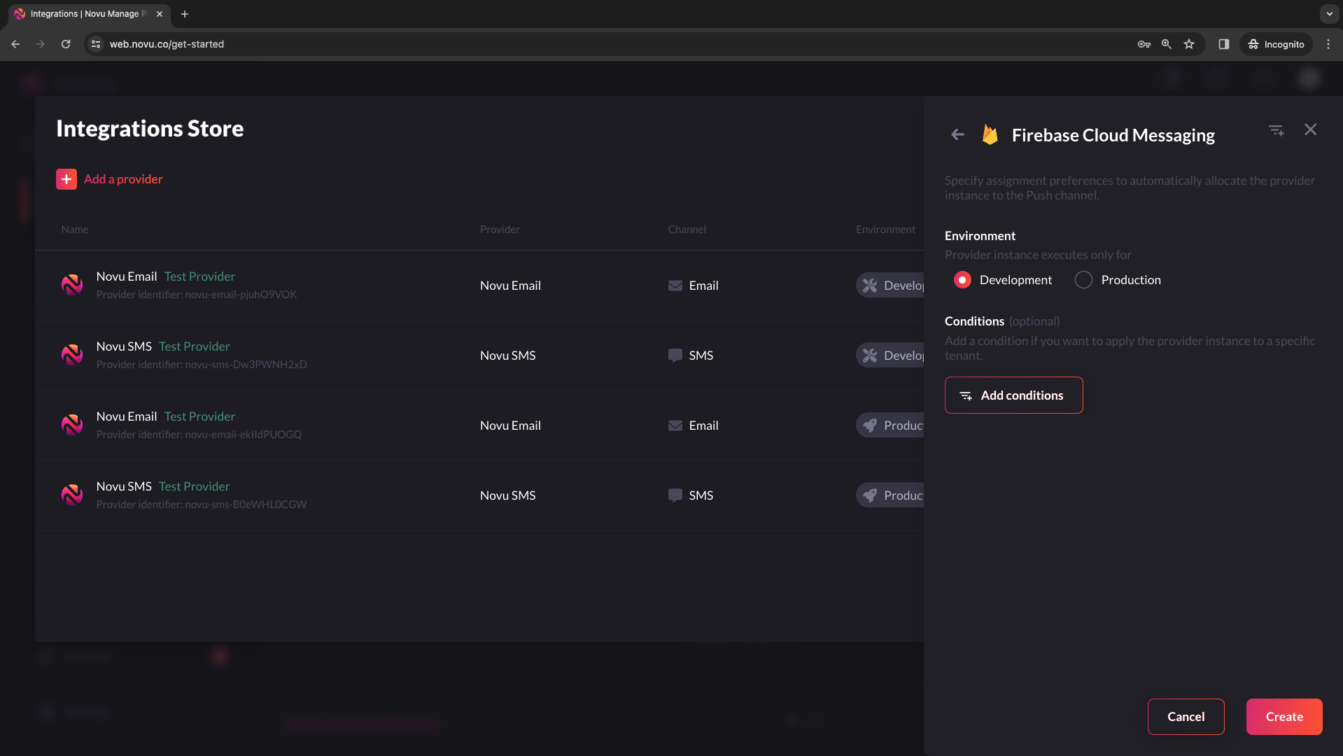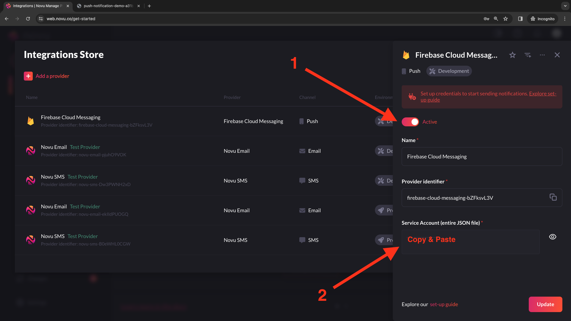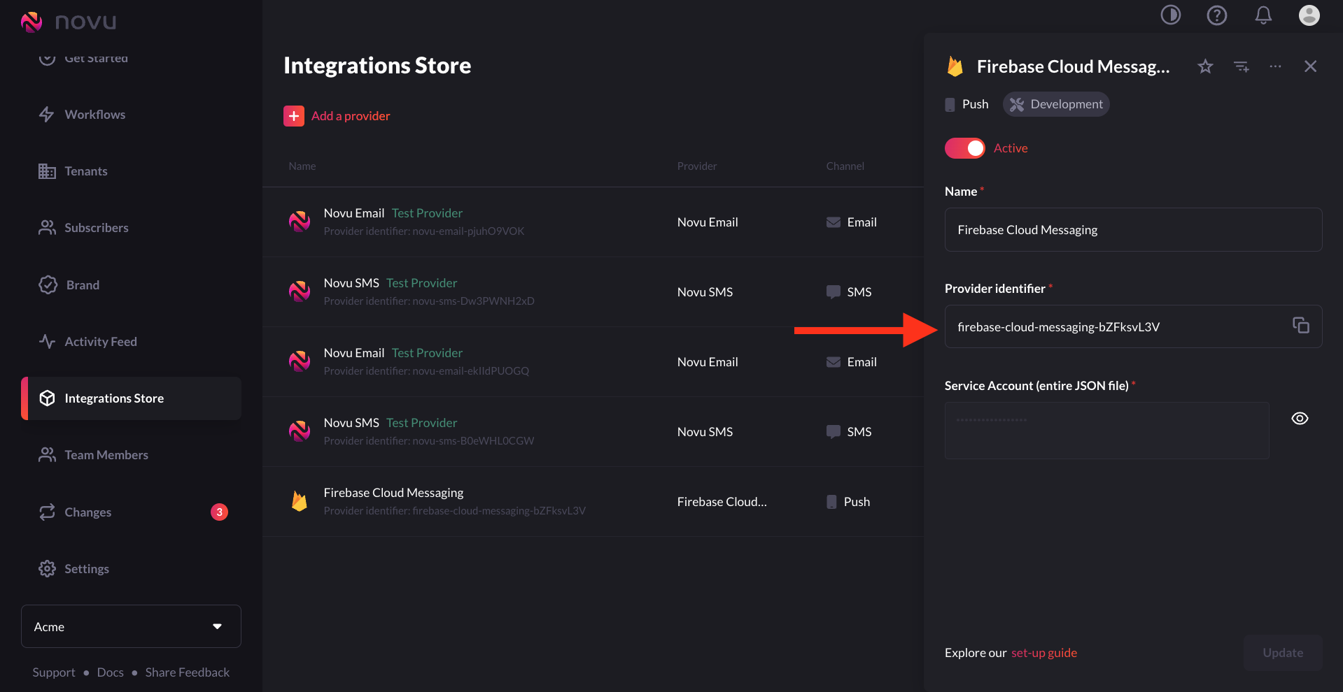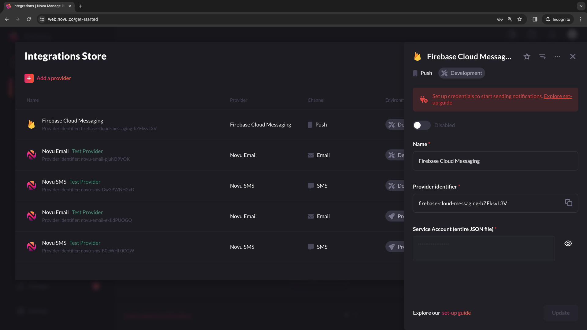 Service Accountfield of the FCM provider in the Integration store on Novu’s web dashboard.