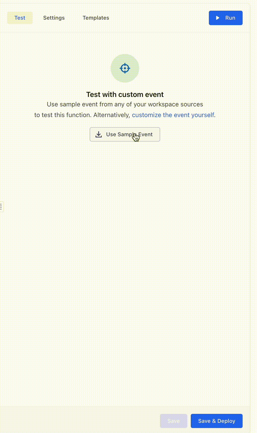 You can test your code directly from the editor in two ways: 1. Use sample events for testing Click Use Sample Event and select the source to use events from.