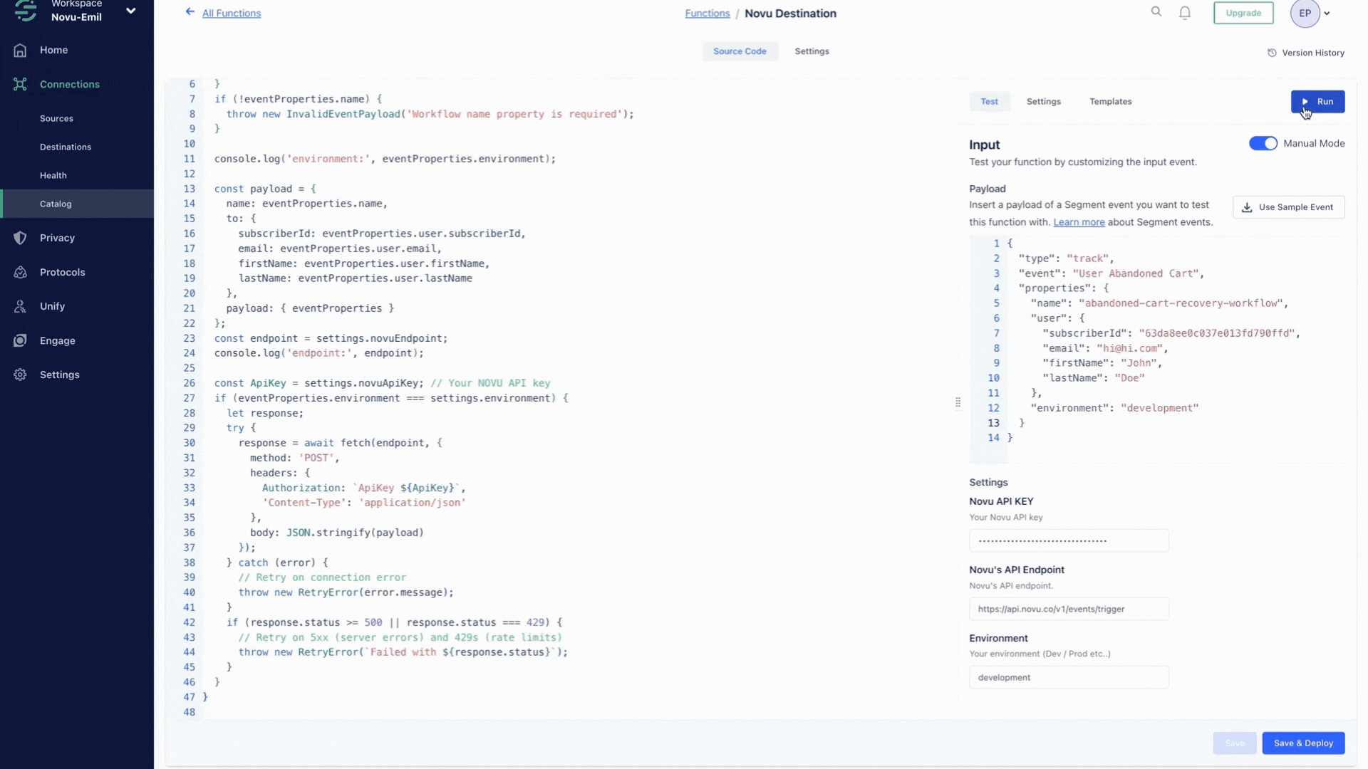Click Run to test your function with the event you selected. 2. Test using manual input You can also manually include your own JSON payload of a Segment event, instead of fetching a sample from one of your workspace sources.