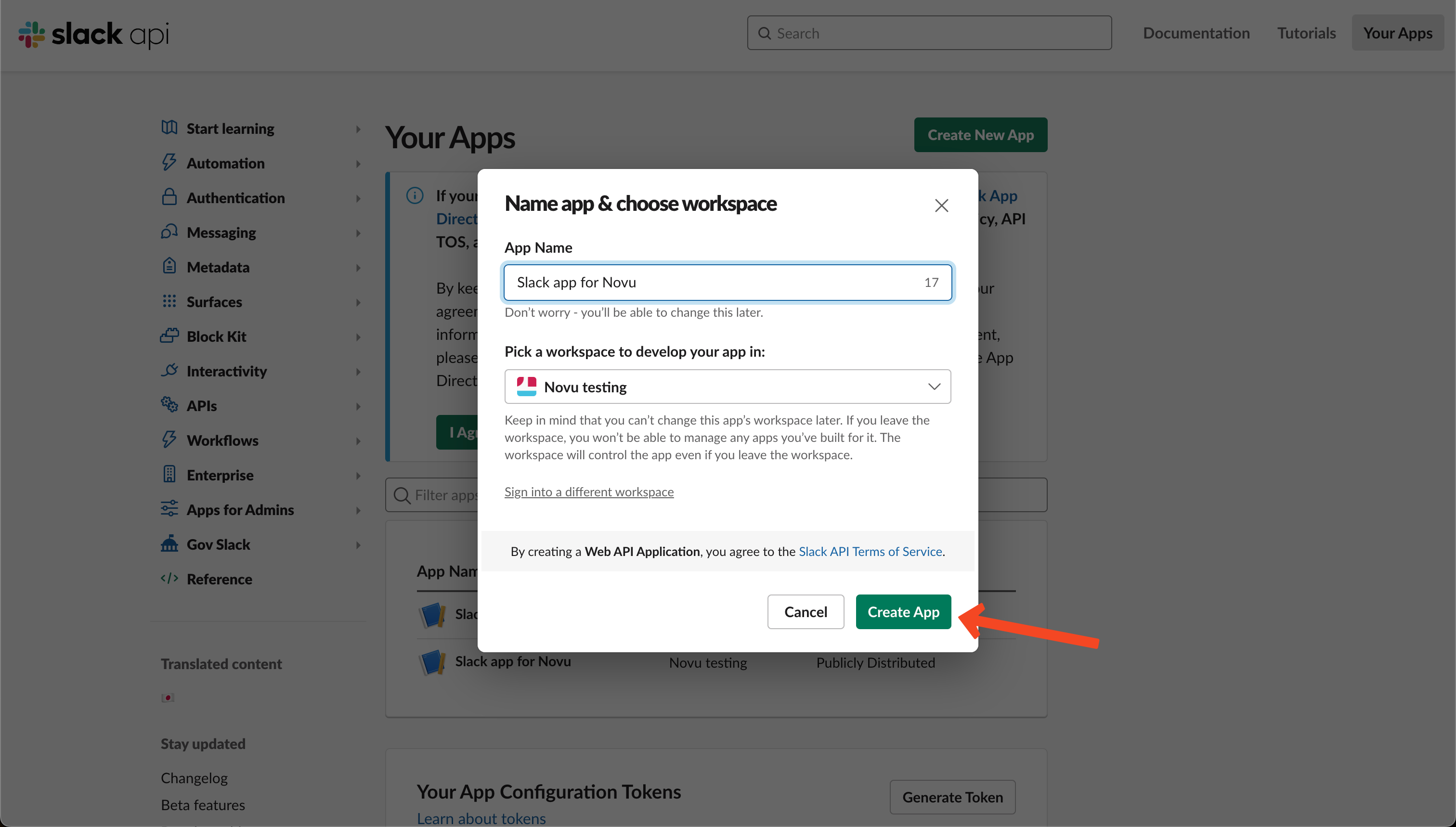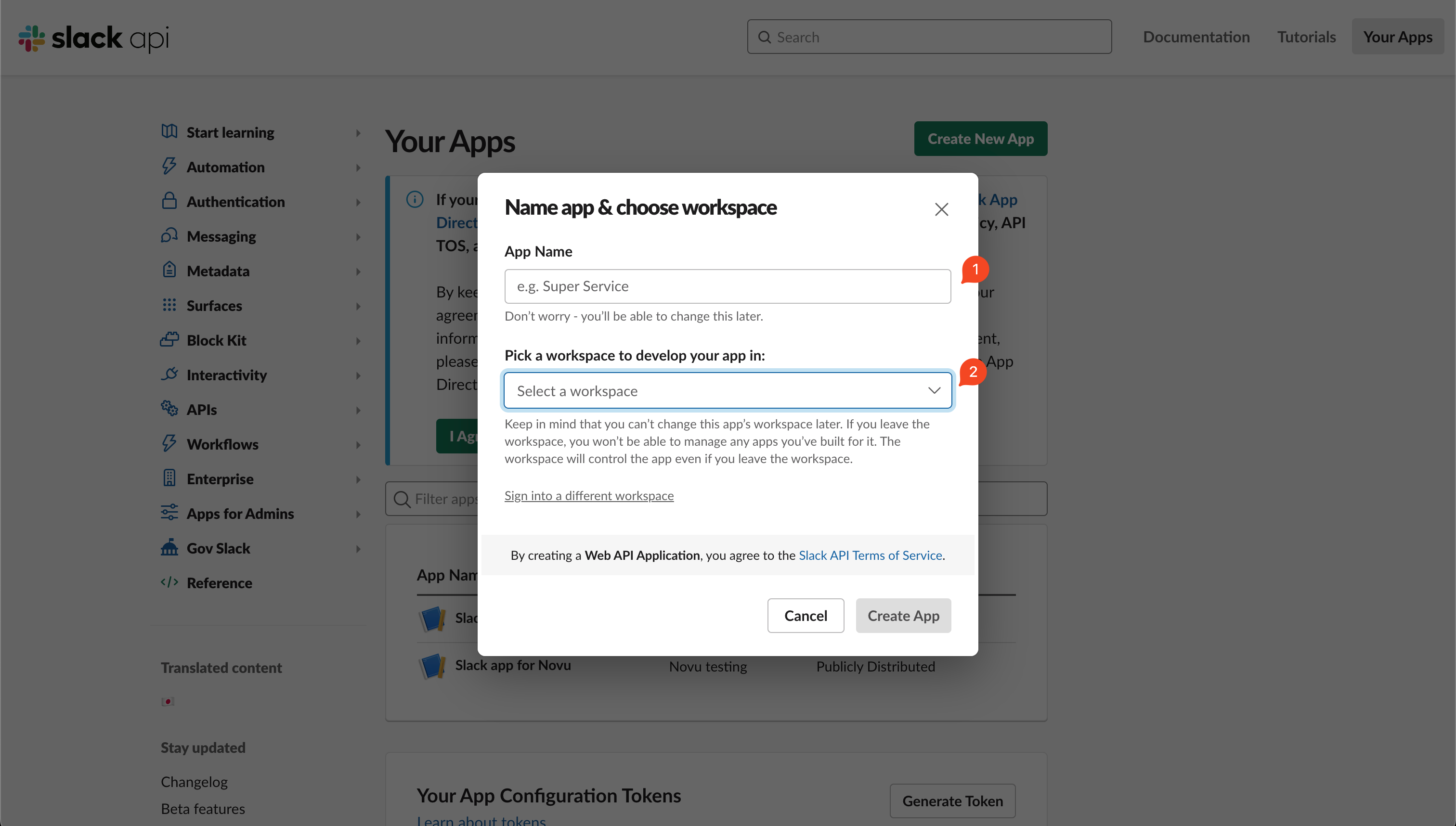 - Choose a name for your app and select the Slack workspace in which you want to send notifications: