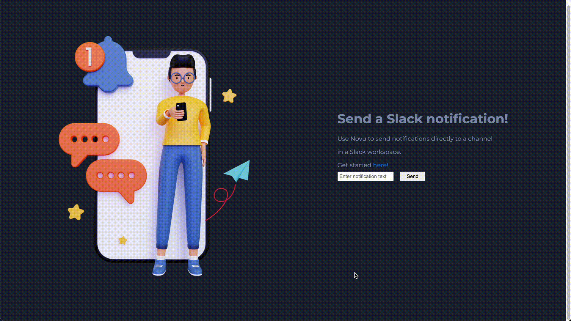 In this guide, you’ll learn how to use Novu to send notifications directly to a Slack channel. But before coding anything up, we first need to go through a setup process. The corresponding docs for this guide are available on our docs.The entire code of this app (frontend as well as backend) can be found here.