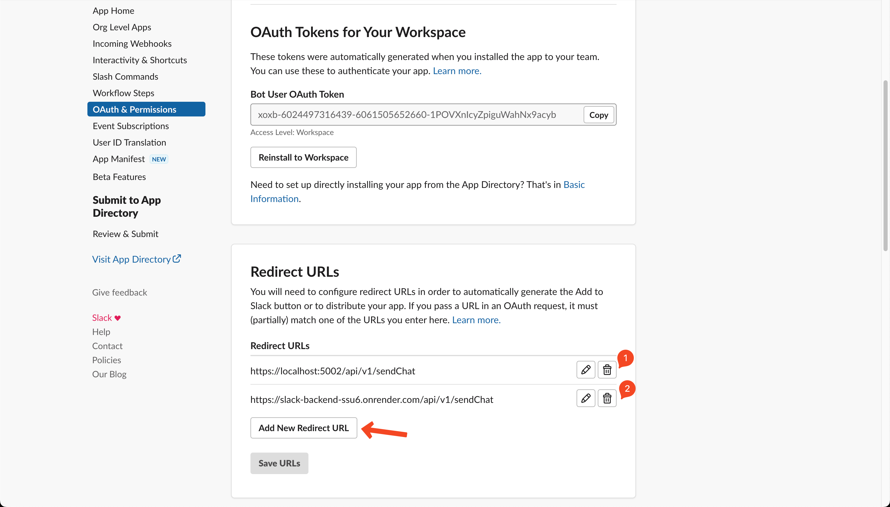 - Finally, we’ll add the route we’d created earlier to the redirect URL section, as shown: