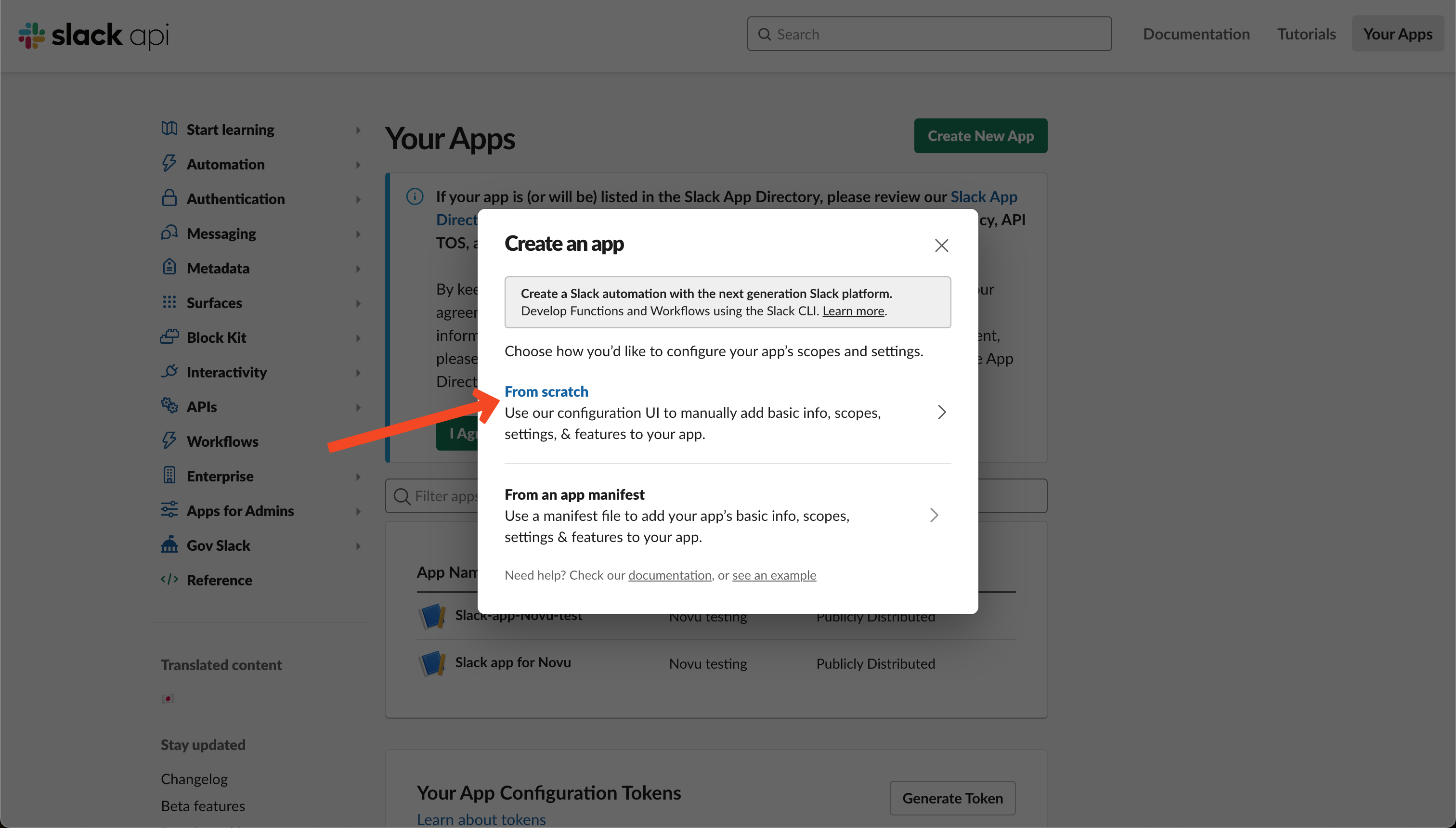 Creating a Slack app is fairly simple. Follow these steps to create your app:- Go to Slack’s app dashboard and click on the ‘Create new App’ button, as shown in the image: