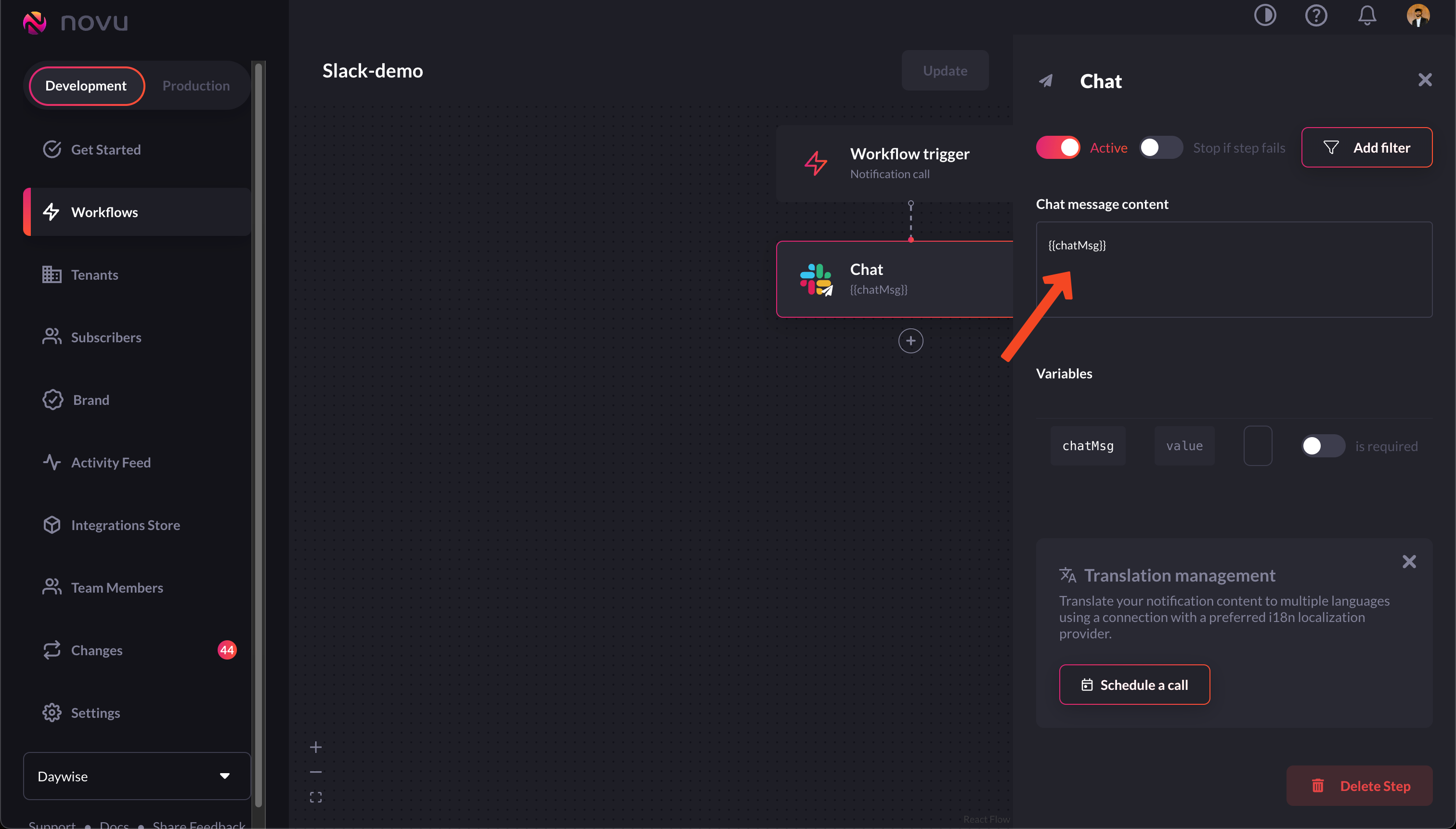 The backend for this app is quite simple. Simply install the Novu package:Notice how we’re expecting ‘chatMsg’ in our payload. This is why we added it as a variable in the workflow created earlier.