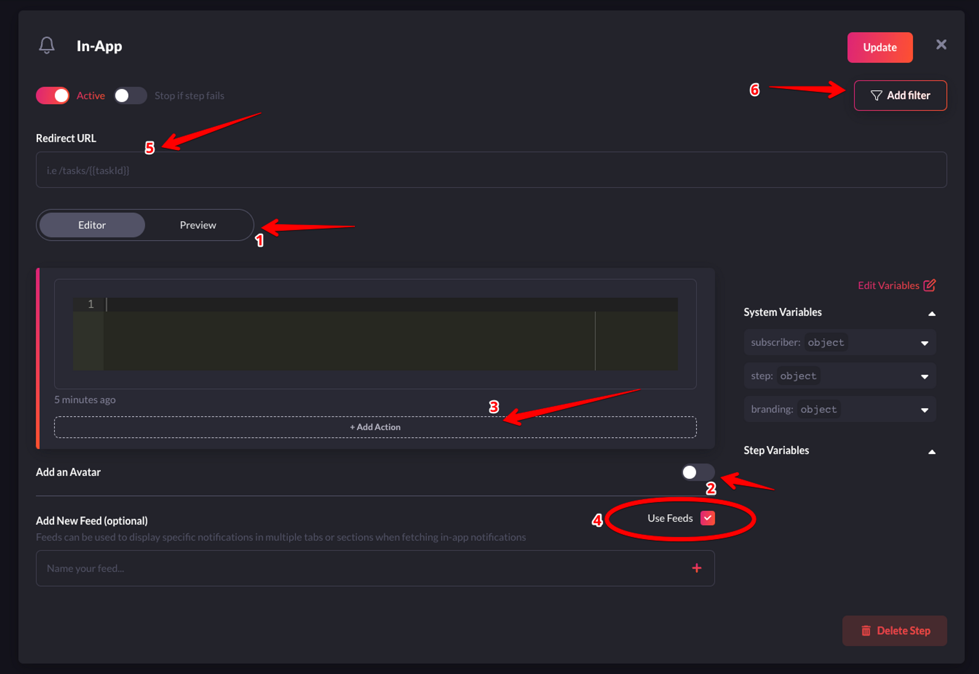 - 7-Editor: You can add text that you want to be displayed in each notification item. Additionally, you can specify custom variables using