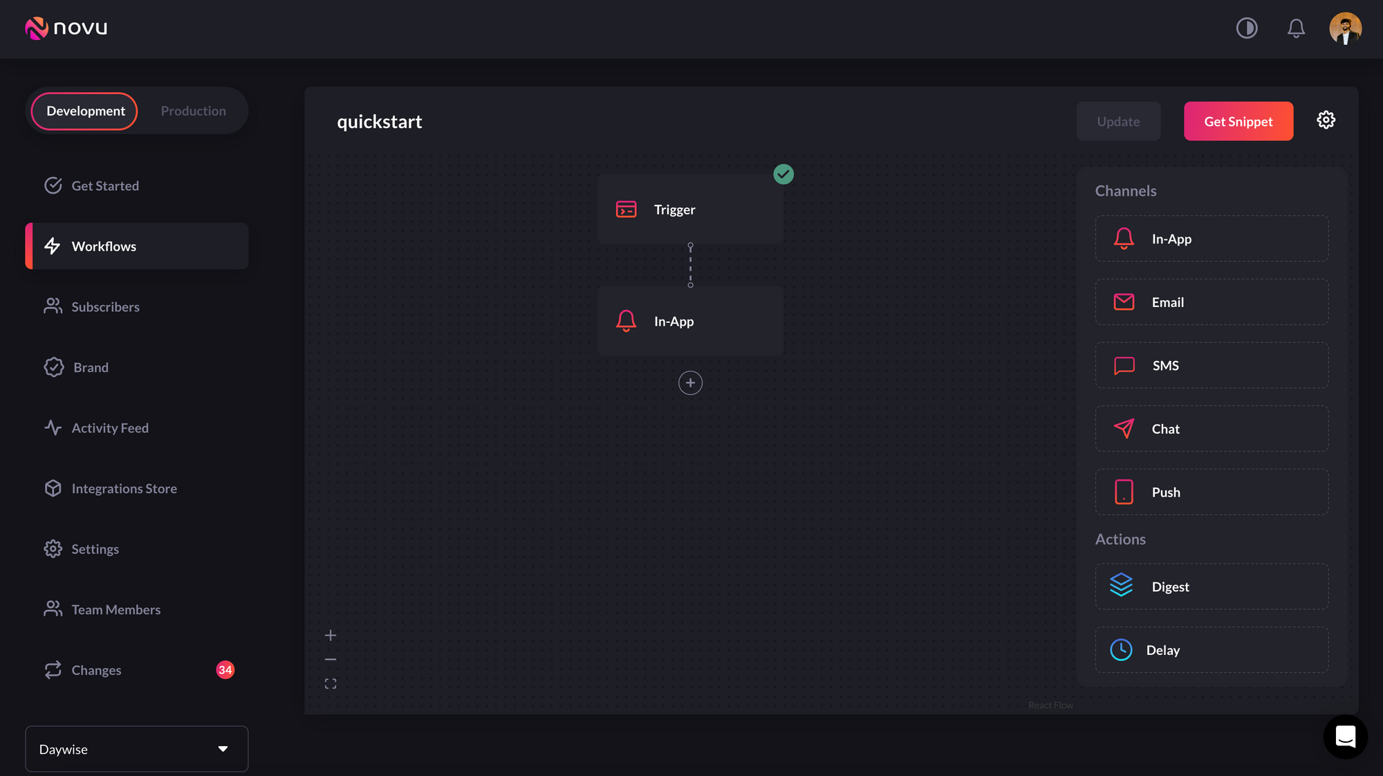 The Novu React package provides a React component library that you can use to add a fully functioning notification center to your React application. To use it, first, install the React Notification Center package by running the following command in your terminal:- Create a workflow to use for sending notifications, and